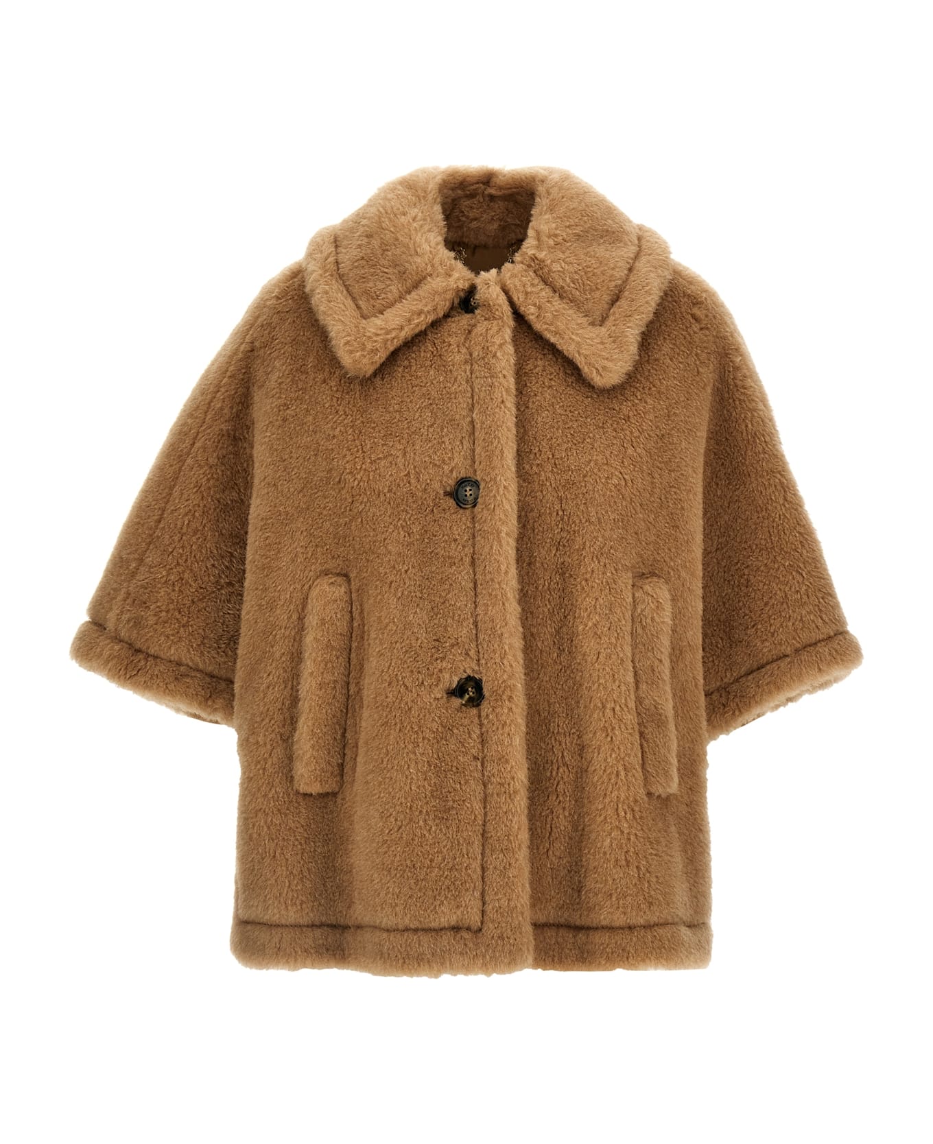 'Tenebre' cape in alpaca and wool Teddy fabric on silk base, button closure, pointed collar, wide short kimono sleeves, pockets. Composition: 63% wp, 26% ws, 11% se