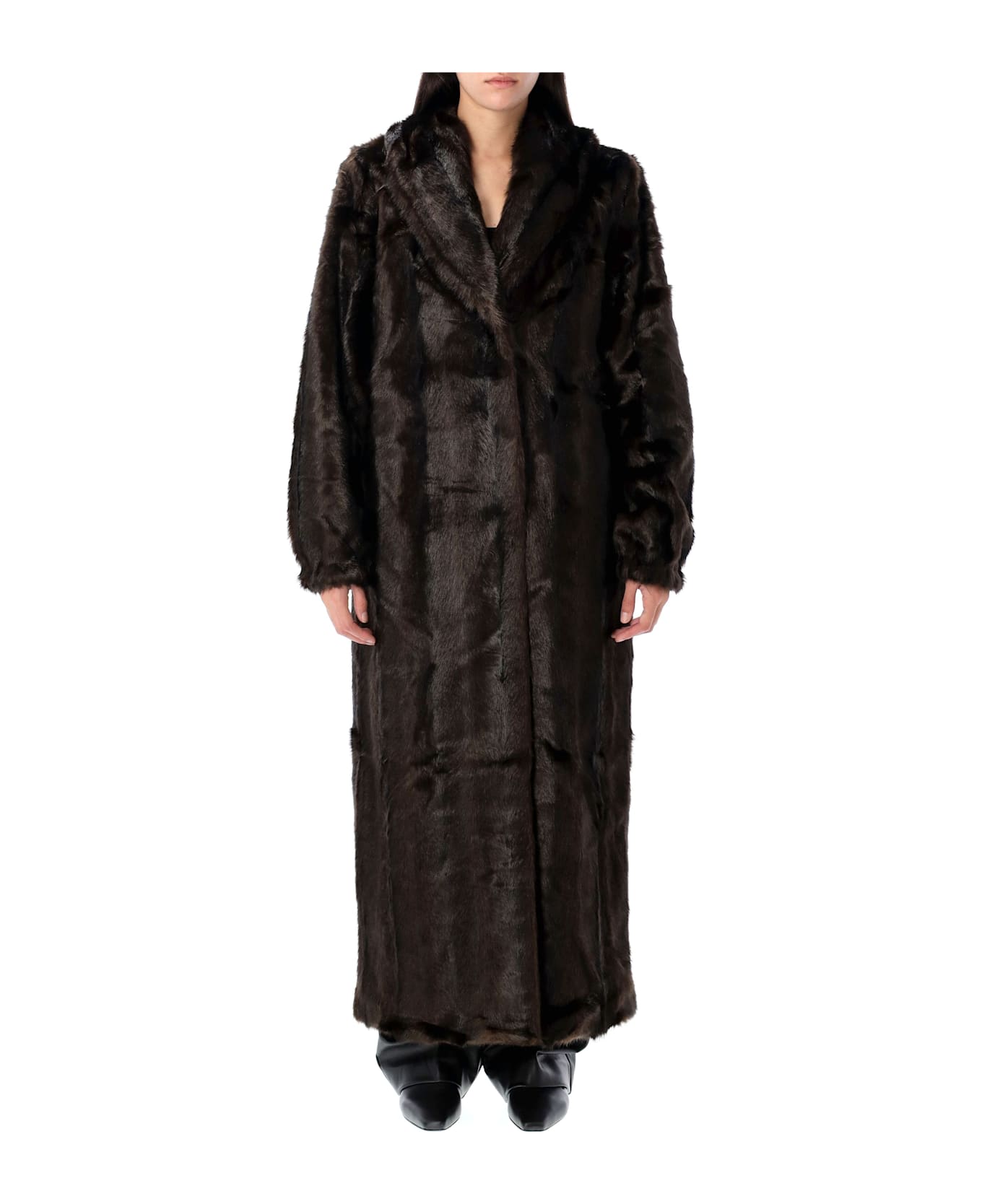 The Dixie Long Vegan Fur Coat By The Garment. Featuring: Shawl Lapel Collar Hidden Press Studs Closure Straight Cut Model Is 1,70 M And Wears Size 8