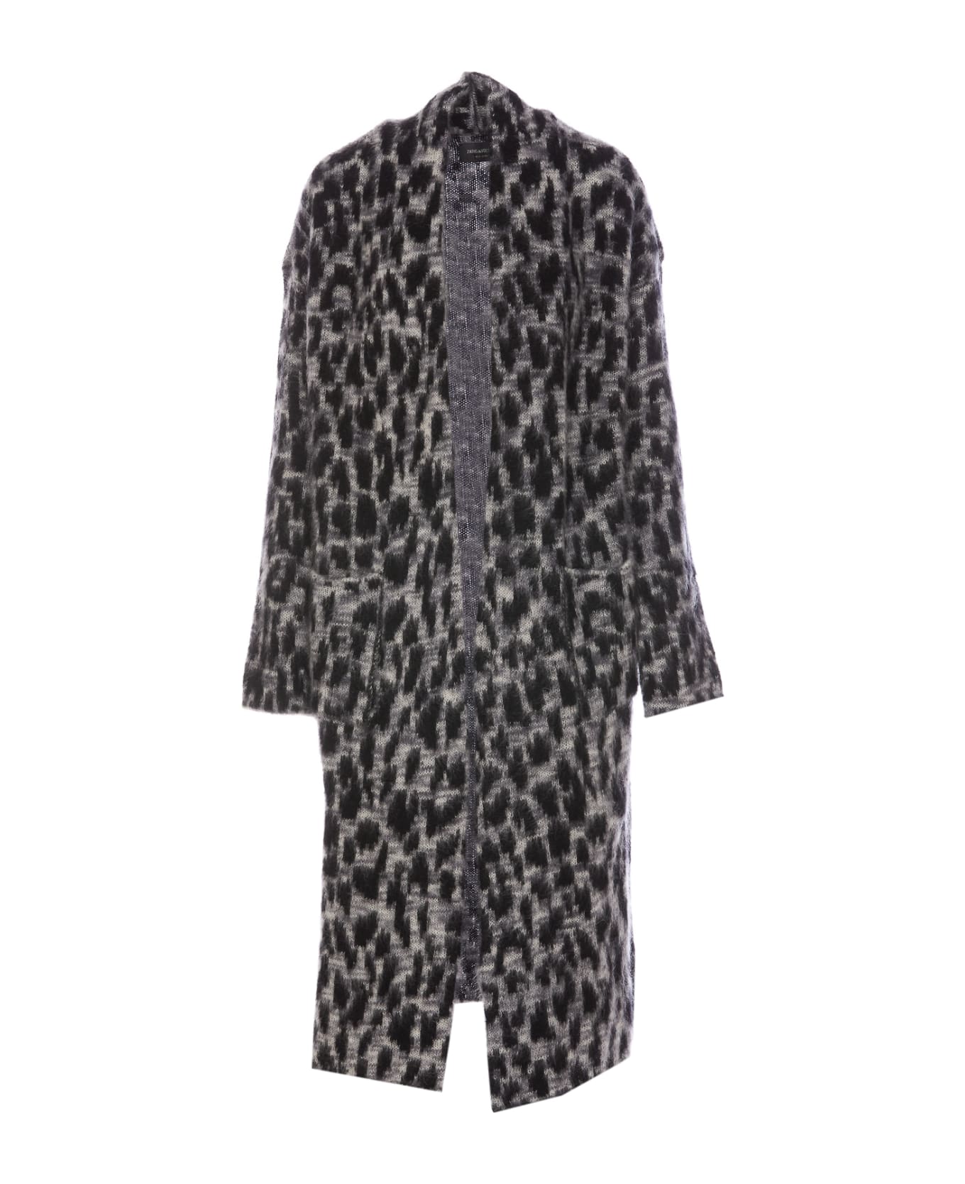 Zadig&Voltaire grey and black Tilda cardigan, maxi model, open silhouette, patterned Composition: 59% Mohair, 30% Polyamide, 11% Wool