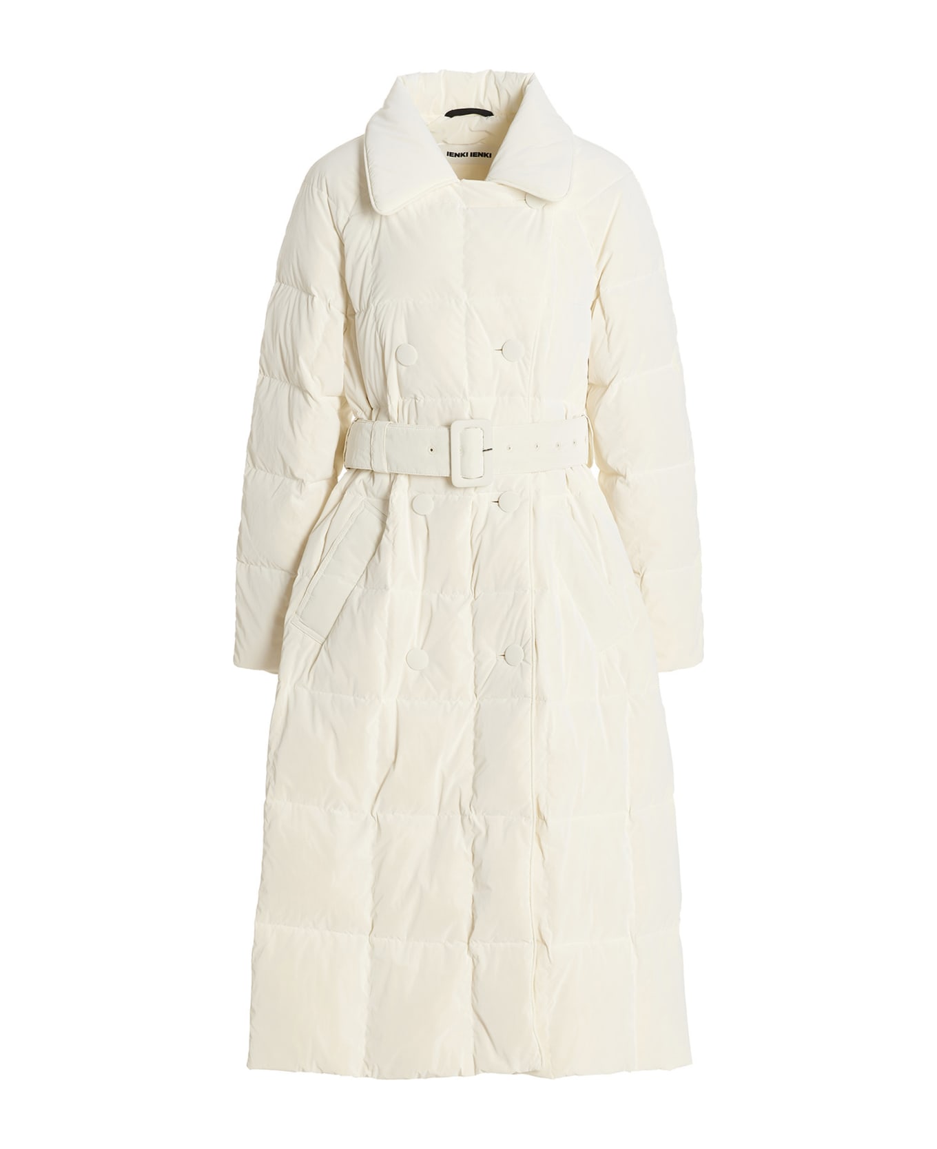 Trench Coat' blue 'powder nylon' long down jacket with goose down padding, button closure, belt at the waist, 'A' silhouette at the back, back split and a comfort fit.