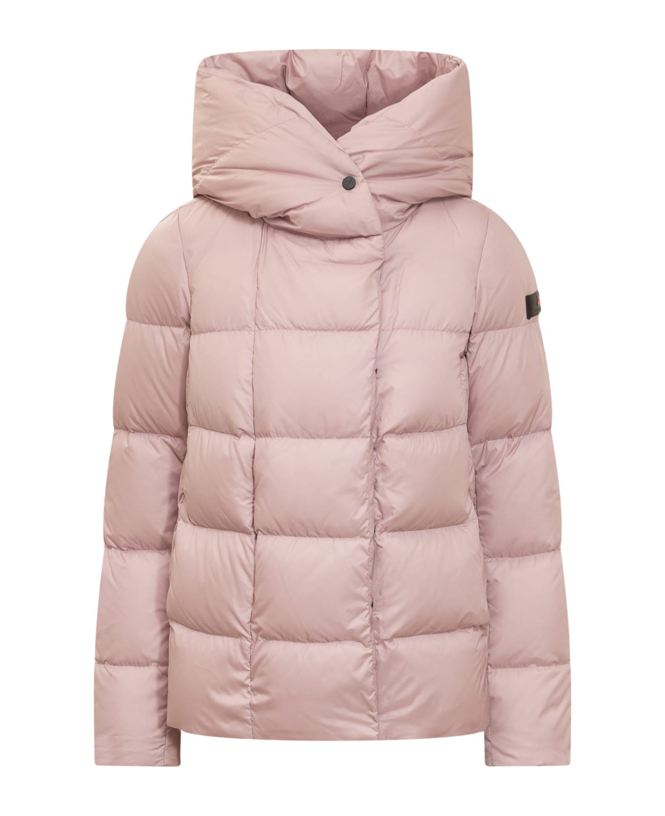 Pink long sleeve down jacket. Hood with button. Front zip and button closure. Side pockets. Logo on sleeve.
