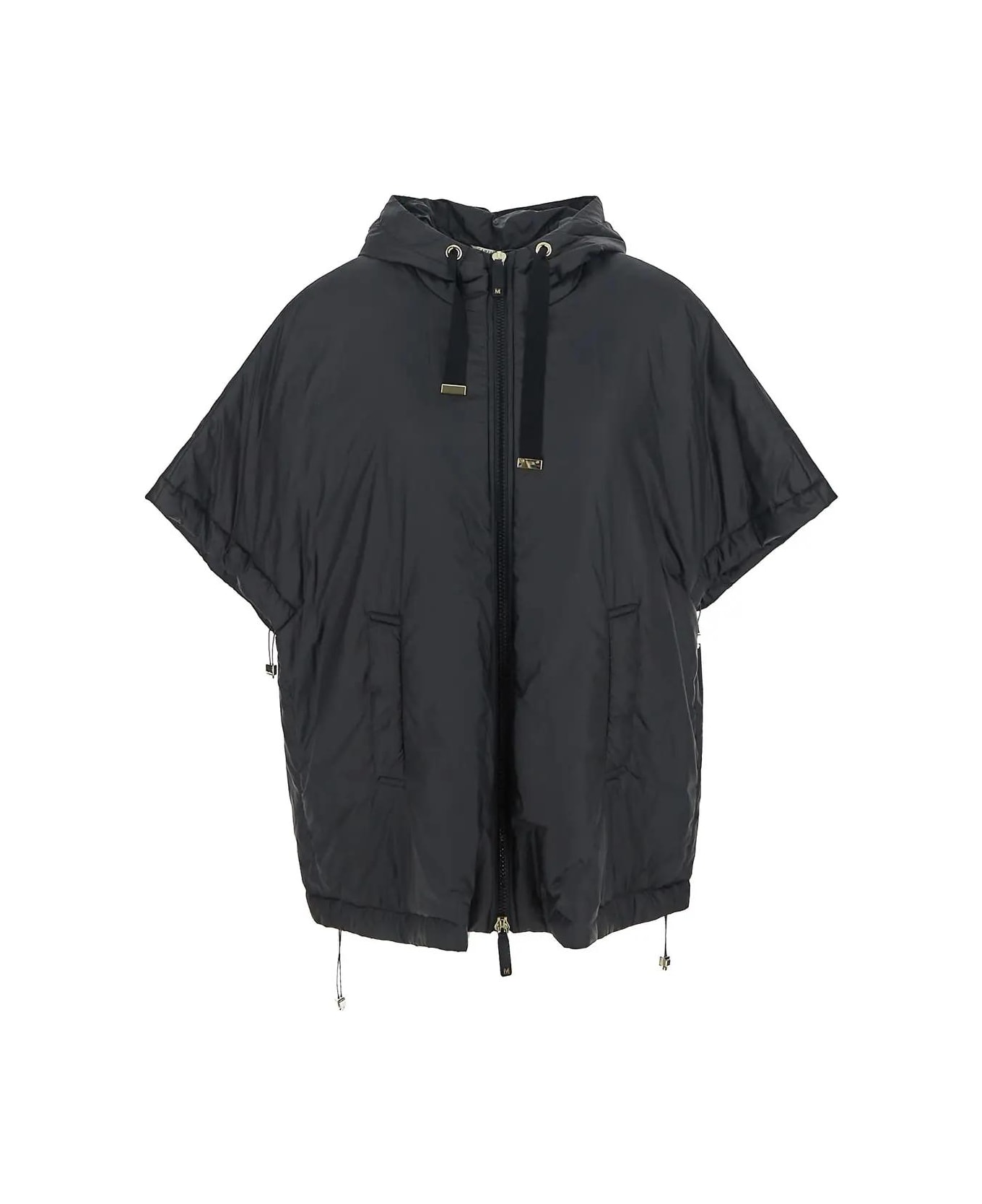 Max Mara The Cube cape in black polyester with drawstring hood, gold-finish metallic aglets, cap sleeves, dropped shoulders, side welt pockets, double-ended zip closure, oversized fit and drawstring on the sleeves and bottom hem.