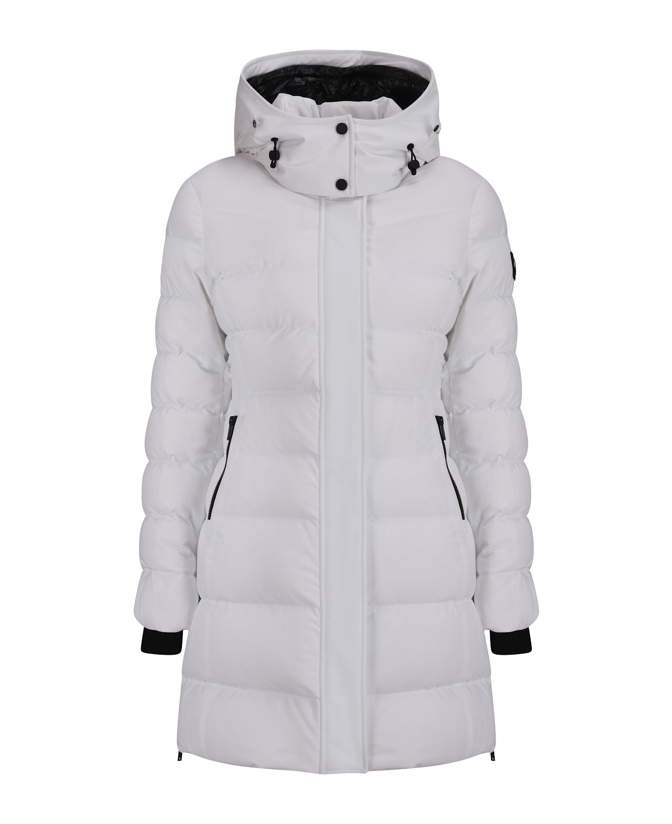 Watershed down jacket by moose knuckles, design with button-removable and drawstring-adjustable hood, front closure by double-slider zipper and magnetic buttons, two zippered welt side pockets, ribbed cuffs, two zippered adjustable side slits, all-over quilted and padded design, monochrome pattern, regular fit.