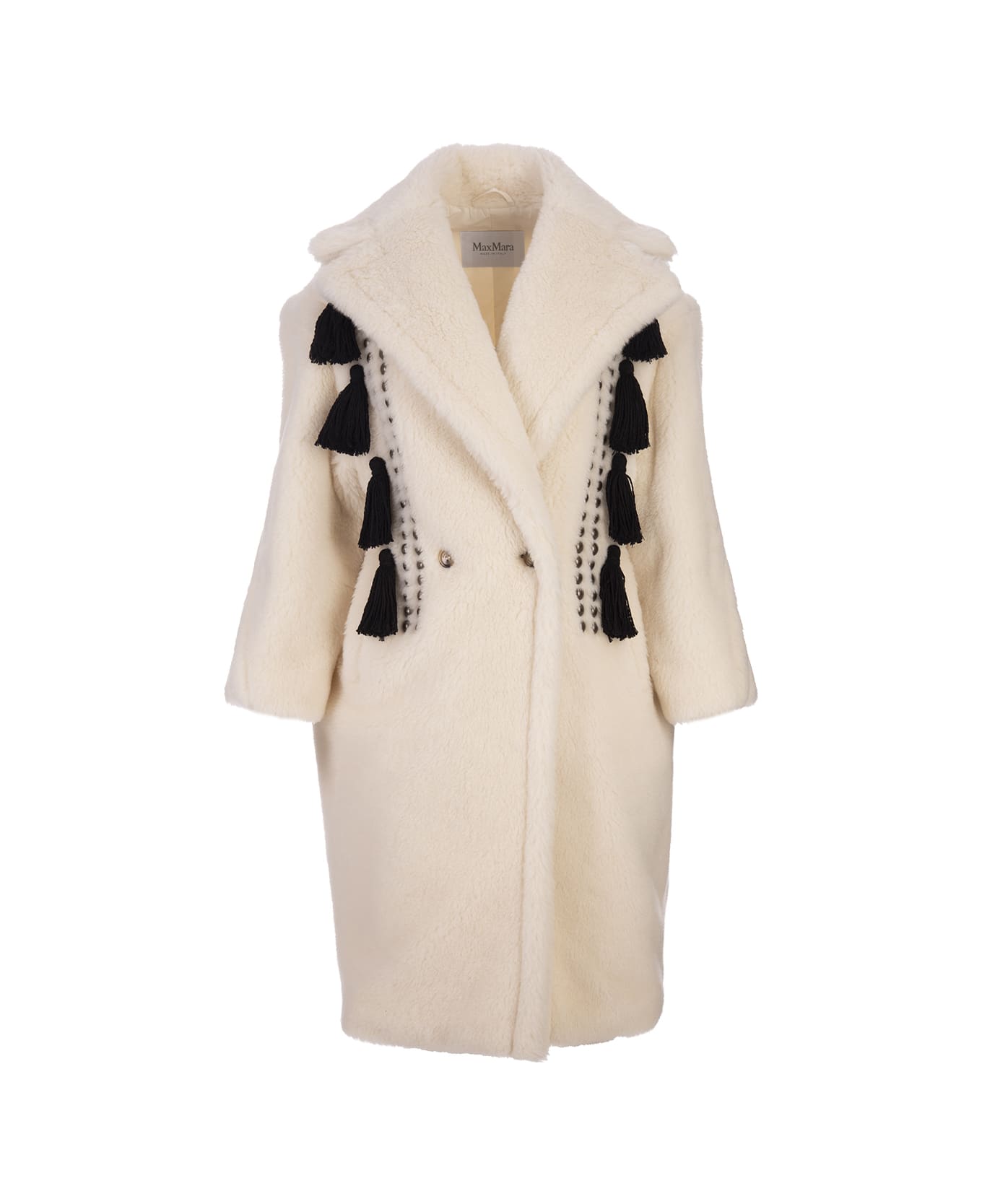 White Demetra coat by Max Mara made from alpaca and wool on a silk base and decorated with symmetrical hand-embroidered studs and tassels on the front, graphic effect. Model with an over line characterised by a lapel collar, low-cut sleeves, double-breasted closure, personalised lining, horn buttons and horizontal welt pockets. Designed in 2013, the Teddy Bear Coat was inspired by an archive garment from the 1980s and immediately became an it coat loved by stars and influencers thanks to its perfect alchemical combination of glamour and playfulness. Its special texture made of alpaca and wool fibres on a silk base is the result of a sophisticated technology, developed by the creative team with an Italian supplier, capable of producing a unique faux fur. The exuberant volume of the coat is a celebration of the opulent extravagance of this fabric.