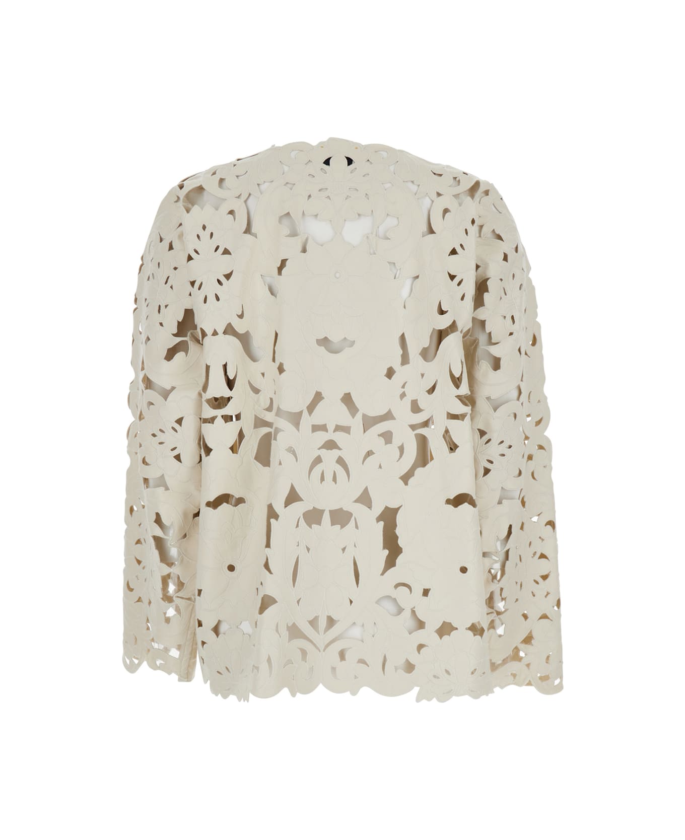 White Jacket With All-over Poetic Orchid Embroidery And Perforated Design In Eco Leather Woman