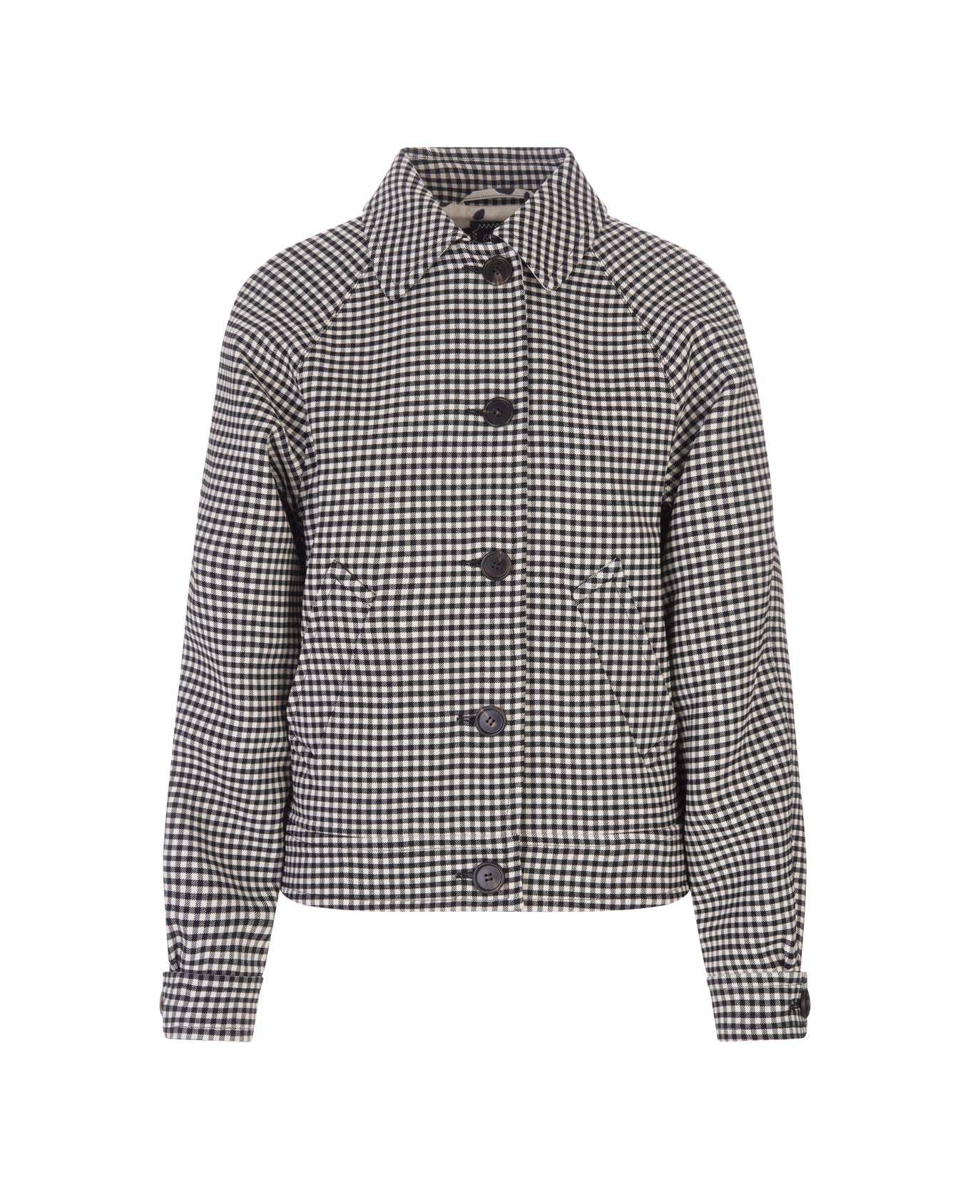 Women's reversible jacket by Marni made from a wool blend with one side in a beige leopard print and one side in a black and white vichy pattern. The garment features a shirt collar, long raglan sleeves, buttoned cuffs, slanted side welt pockets, and a front button fastening.