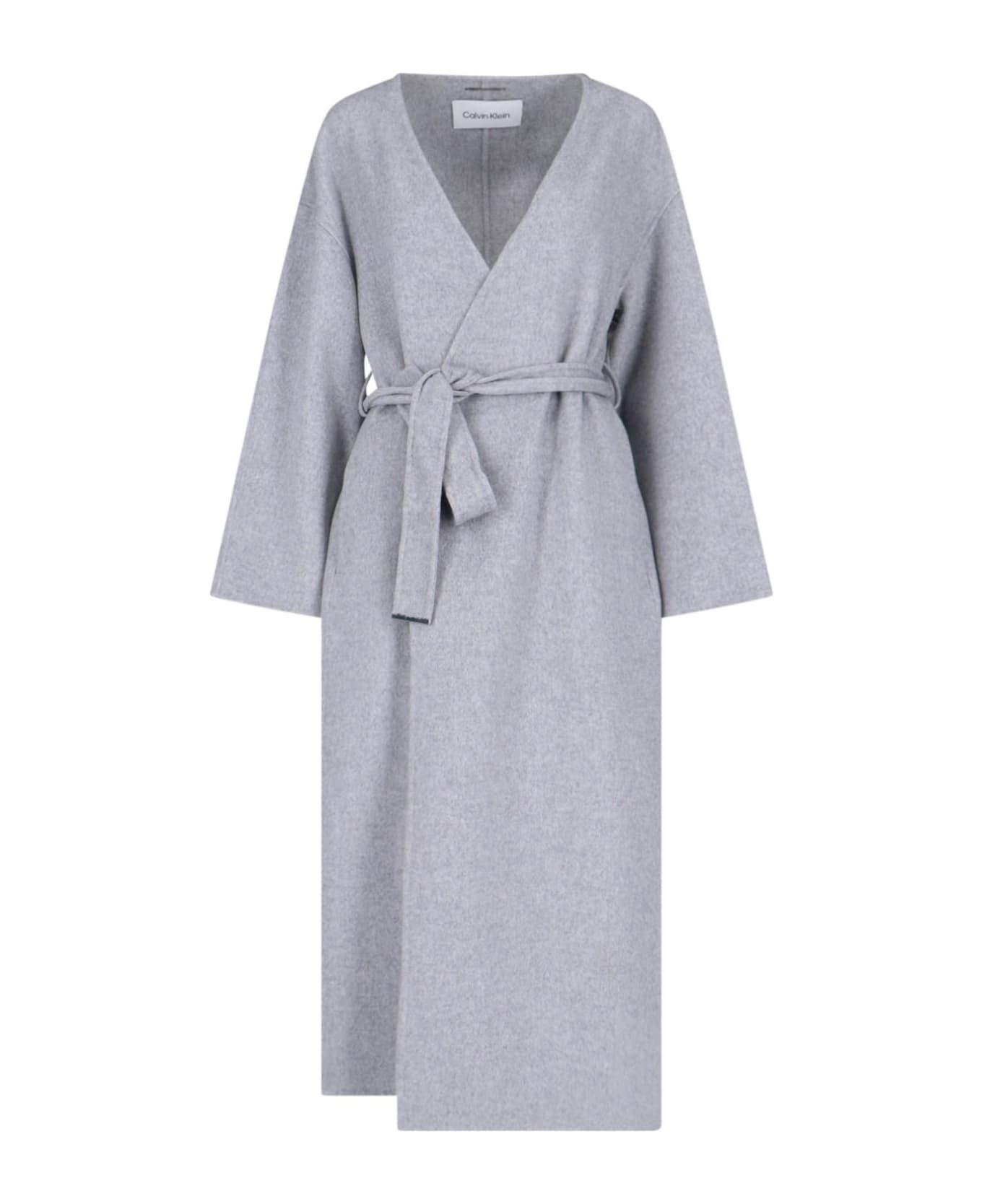 Calvin Klein wool blend coat in gray color with V-neck, knotted waist belt, two side welt pockets, silver metal logo at the back, straight hem.