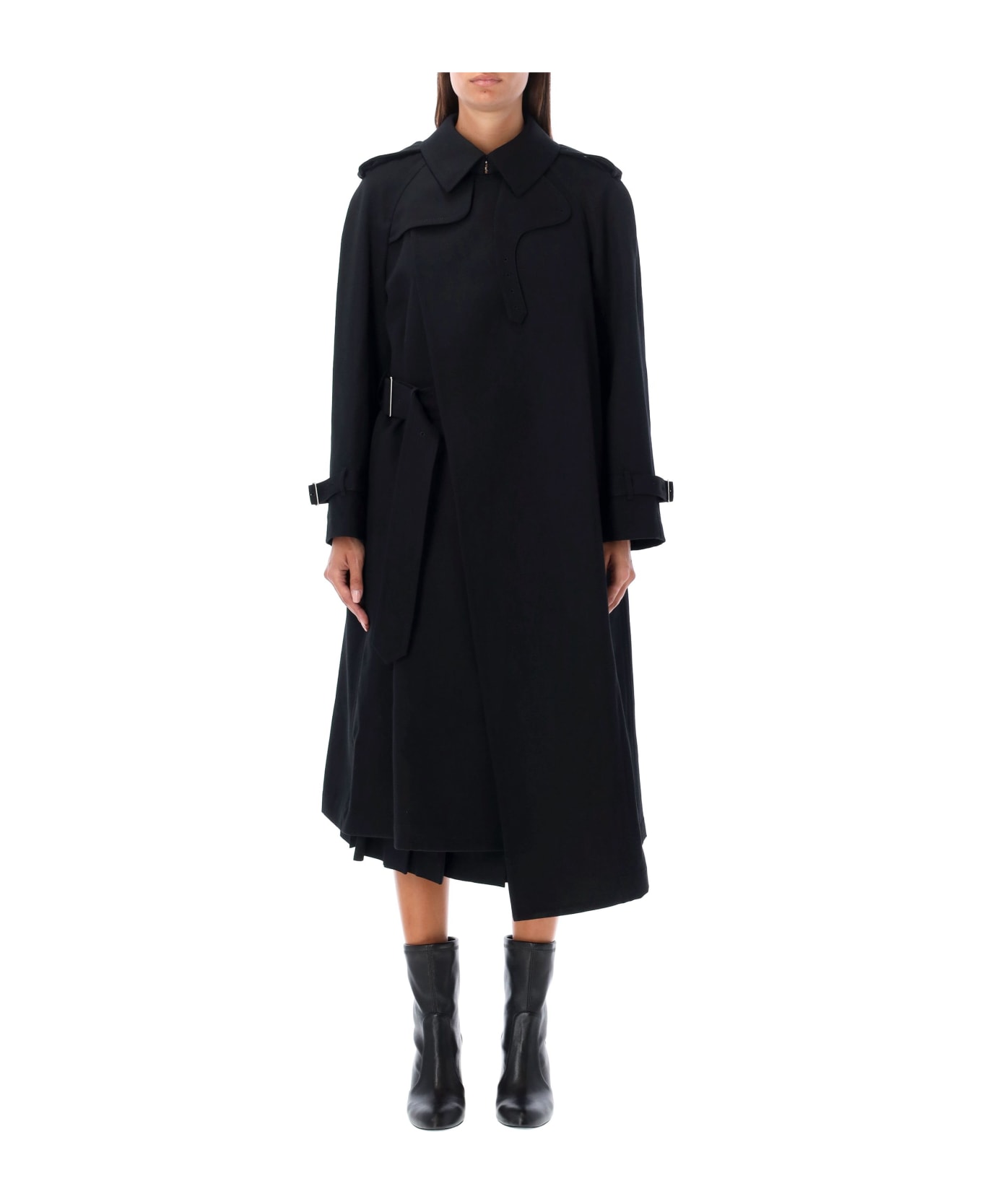 Wool Trench By Comme Des Garçons. Featuring: Long Sleeves Point Collar Adjustable Strap At Neck Hidden Button Closure At Front Buttoned Straps On Shoulders Belt Loops At Wrists Adjustable Strap With Buckle At Wrists Lateral Pockets Belt Loops At Waist Detachable And Adjustable Belt At Waist Faux Rear Vent Flared Model Is 1,72 M Tall And She Is Wearing Size S