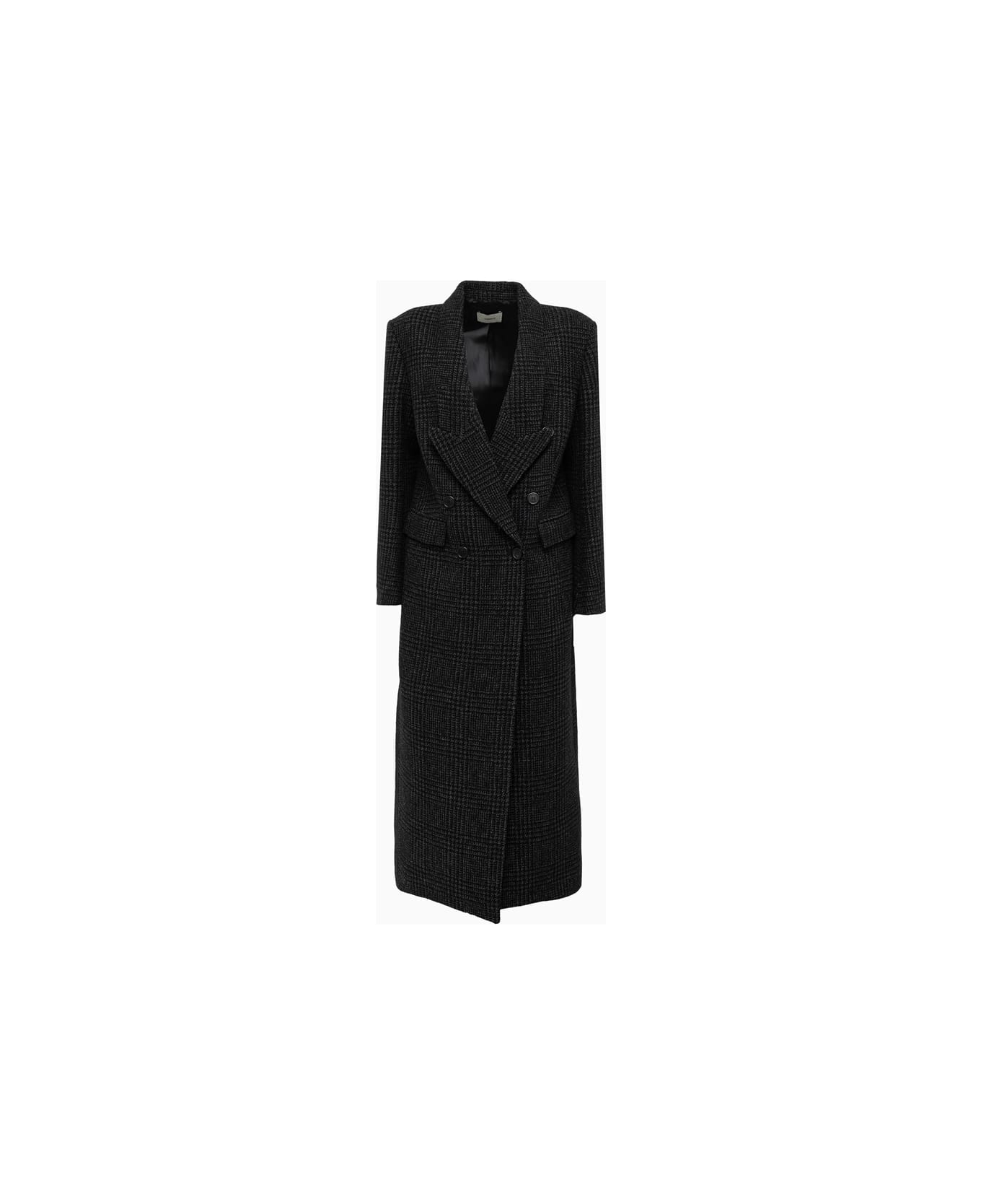 Double-breasted coat in Tartan print wool blend. Lightly padded shoulders. Macro collar with peaked lapels. Front closure with logo buttons. Front flat pockets with flap. Long sleeves, branded metal button at the cuffs. Central vent at back. Solid color lining. Regular long fit. COMPOSITION 36% WOOL 28% ACRYLIC 25% POLYESTER 11% POLYAMIDE.