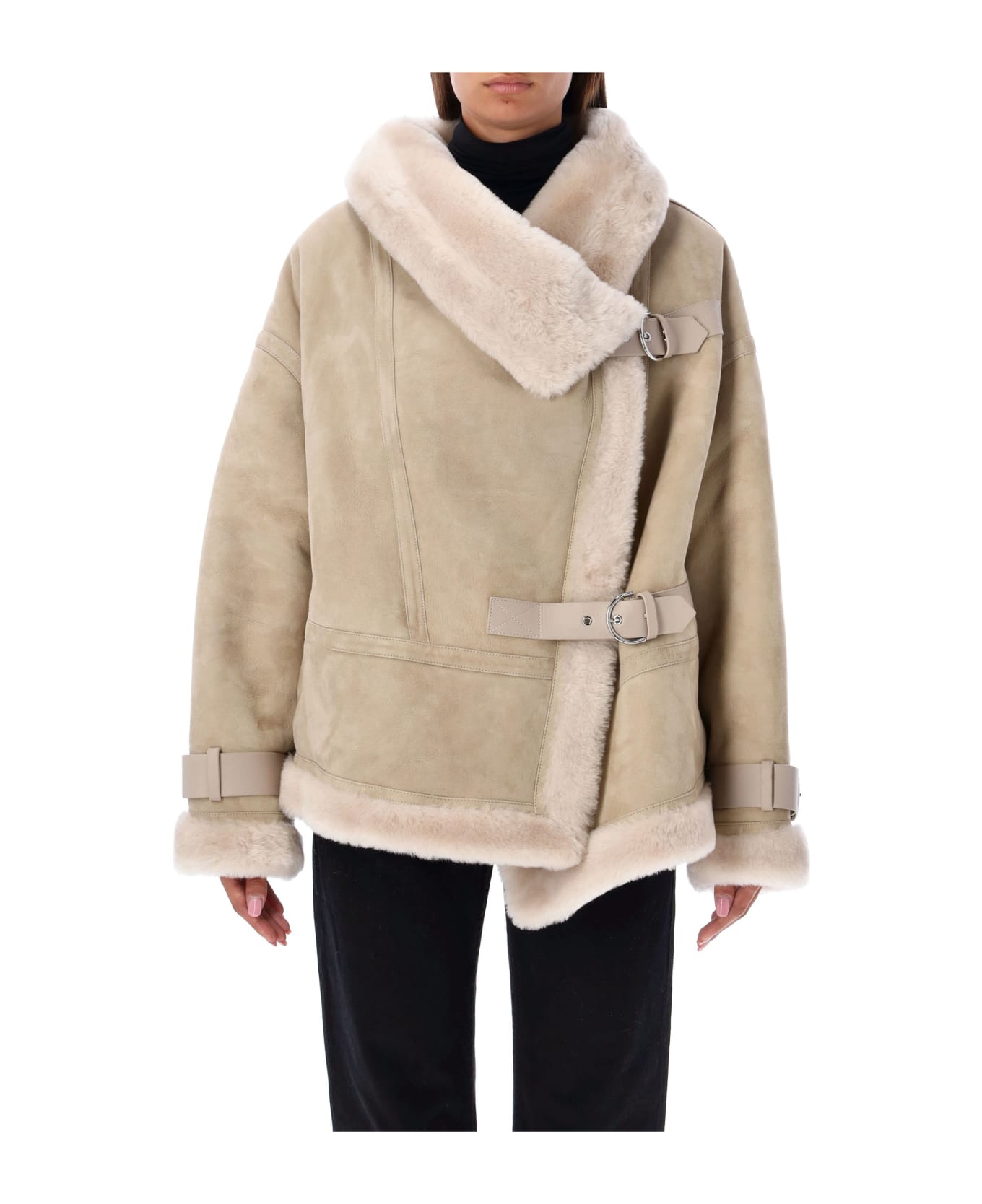 Darling Shearling Jacket By Shoreditch Ski Club. Featuring: Oversized Fit V-neck Bridle Leather Trims Double Adjustable Belt With Buckle Closure On Left Side Decorative Belt With Buckle On Wrist Shearling Collar And Edges Shealing Lining Model Is 1,72 M Tall And He Is Wearing Size S