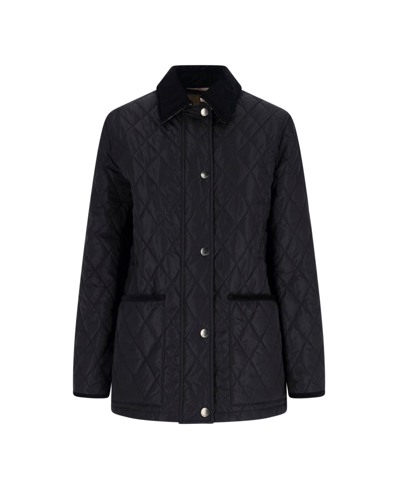 Burberry diamond quilted jacket in black nylon with classic corduroy collar, button closure, two side flat pockets, and straight hem.
