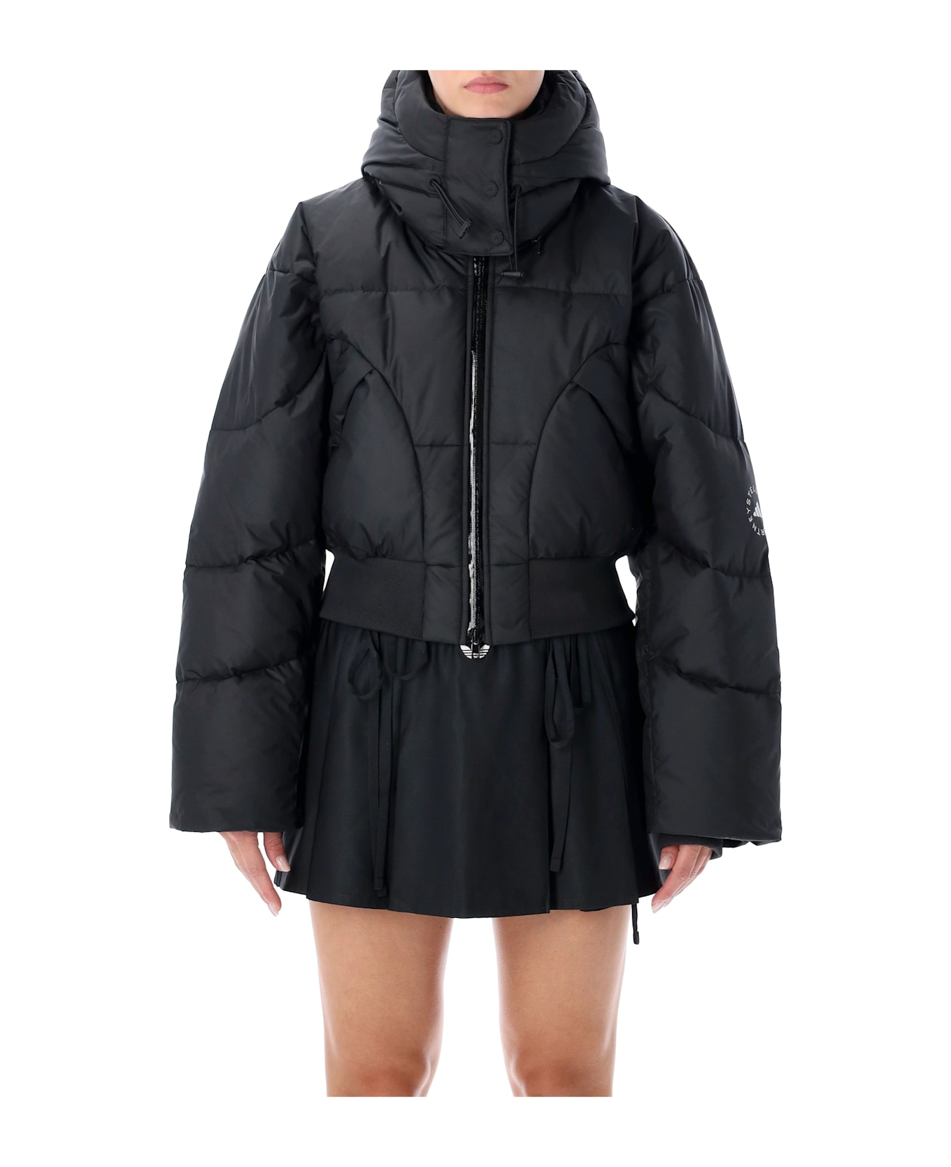 The Adidas By Stella Mccartney Cropped Puffer Blends Athletic Design With Refined City Style. Made From Recycled Technical Fabric, It Features Eco-friendly Insulation For Lightweight Warmth And A Structured Cropped Silhouette With An Elastic Waistband. The High Collar With An Detachable Hood And Two-way Front Zip Ensure Comfort And Weather Protection, While The Signature Sleeve Logo Adds A Sleek Finishing Touch. Recycled Technical Shell High-performance Eco Insulation High Collar With Adjustable And Detachable Hood Two-way Front Zip Closure Elasticated Ribbed Waistband Wide Sleeves With Inner Cuffs Adidas By Stella Mccartney Logo On Sleeve Alessandra Is 1,75 M And Wears Size S