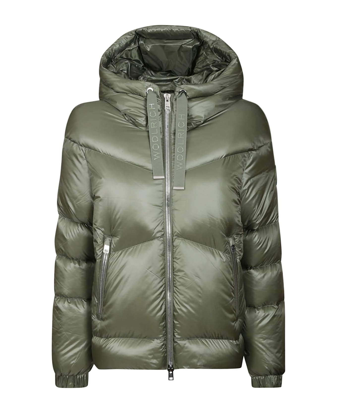 The WOOLRICH short down jacket - A soft and comfortable piece perfect for the coldest days. Made of water-repellent and wind-resistant satin nylon, it is filled with duck down. It has a zip closure, a high protective collar, and a large hood. The two convenient pockets are perfect for carrying small items, and the drawstring at the bottom allows for adjustable fit.