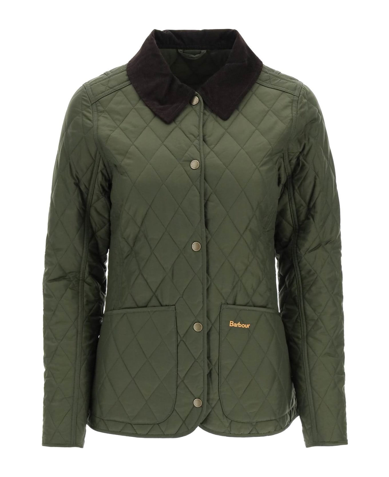 Barbour diamond-quilted short nylon jacket with slim silhouette. It features pointed corduroy collar, press-button fastening and wide side patch pockets. FInished by a contrasting logo embroidery on the pocket. The model is 177 cm tall and wears a size UK 8.