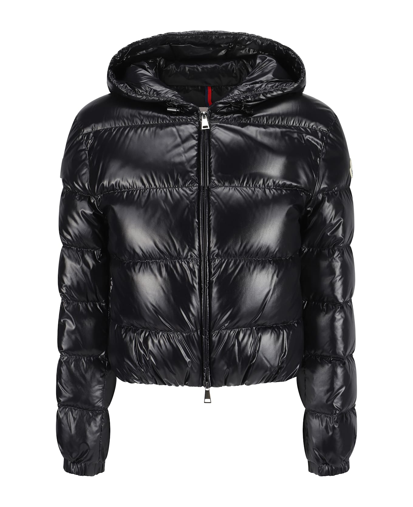 Bayard down jacket by moncler, high collar and drawstring hood design, double-slider front zipper closure, two zippered side welt pockets, contrasting embroidered iconic brand logo patch on arm, elasticized cuffs, elasticized waistband, all-over quilted and padded design, regular fit.