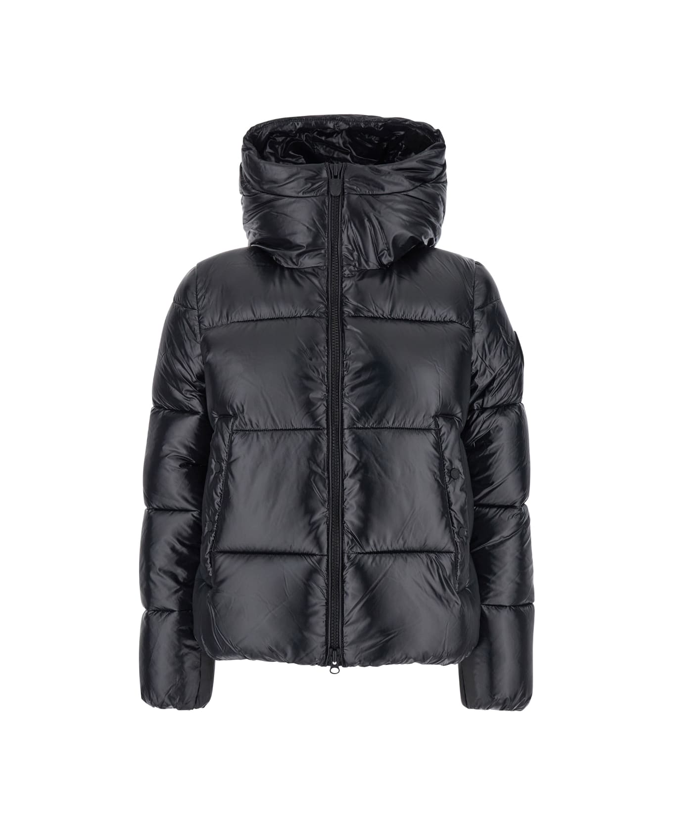 'biddy' Black Down Jacket With Hood And Logo Patch On The Sleeve In Tech Fabric Man