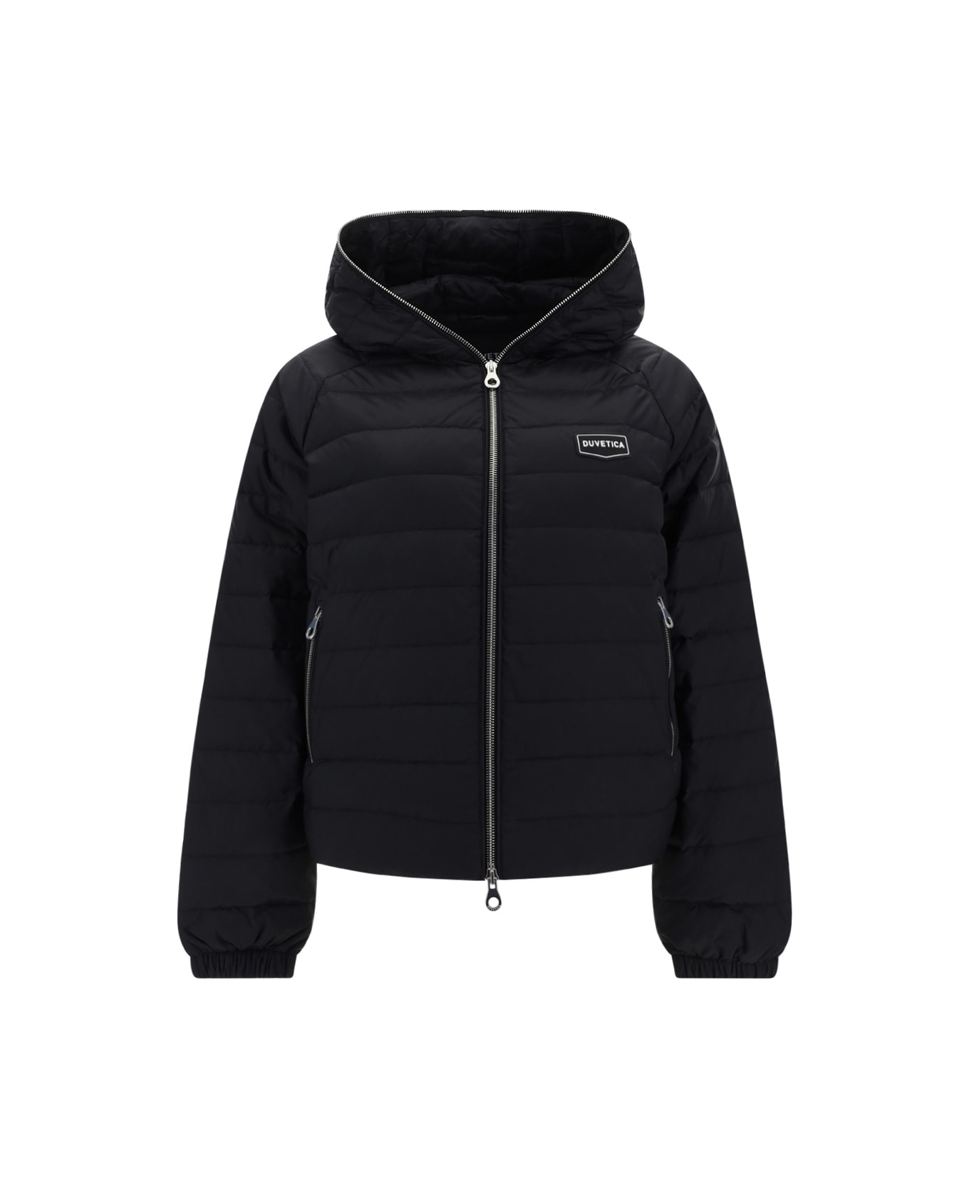 Caroma down jacket by duvetica, double-slider front zipper closure, lightweight quilted and padded design, zippered hooded jacket, elastic cuffs, two zippered side welt pockets, contrasting iconic brand monogram patch applied to front.