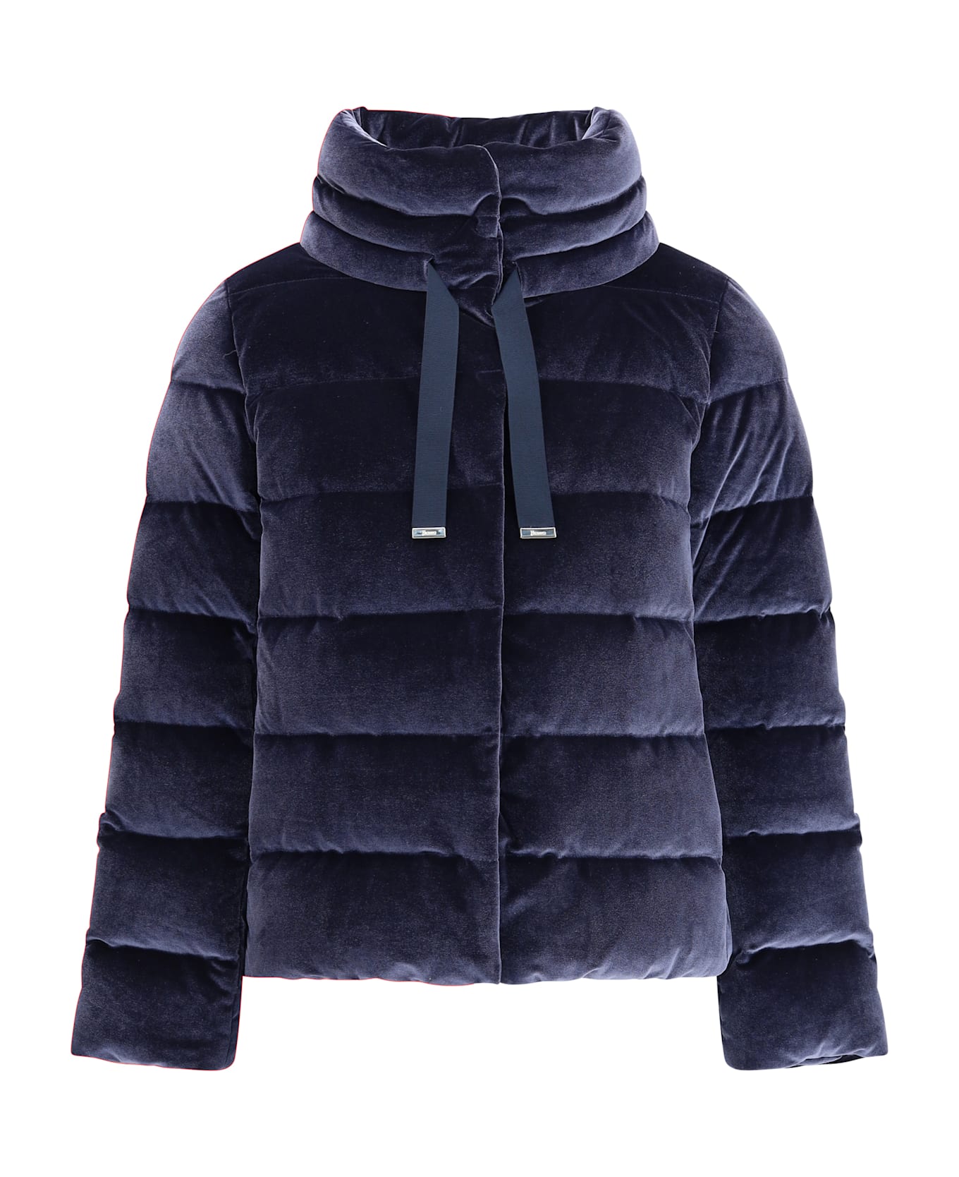 The chenille-effect cotton down jacket by herno features an adjustable drawstring high collar for comfort and protection. the front snap-button closure offers practicality, while the two side welt pockets add functionality. the quilted and padded design ensures warmth and modern style, ideal for facing the cold season with elegance.