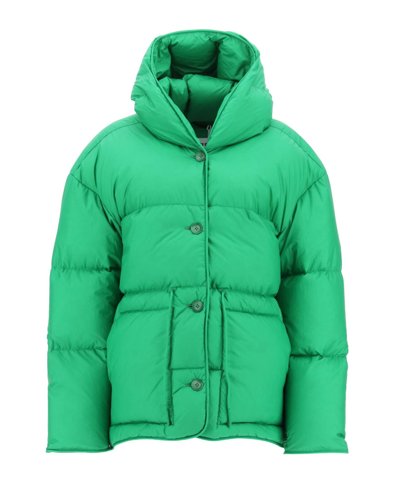 Puffer jacket by Ienki Ienki made of quilted matte-finish nylon ripstop with goose down padding. Design characterized by an oversized fit adjustable with inner drawstring at waist featuring a fixed hood, front button closure and patch pockets. Lined interior. The model is 177 cm tall and wears a size XS.