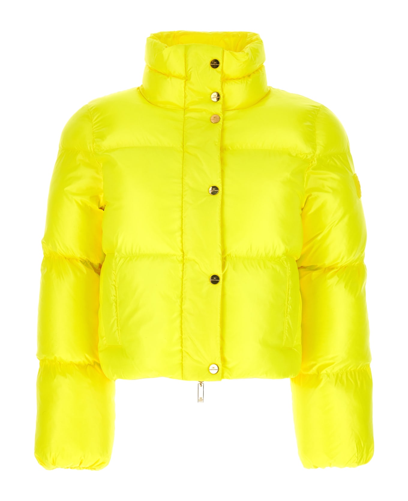 Padded crop down jacket with gold logo snap button closure.