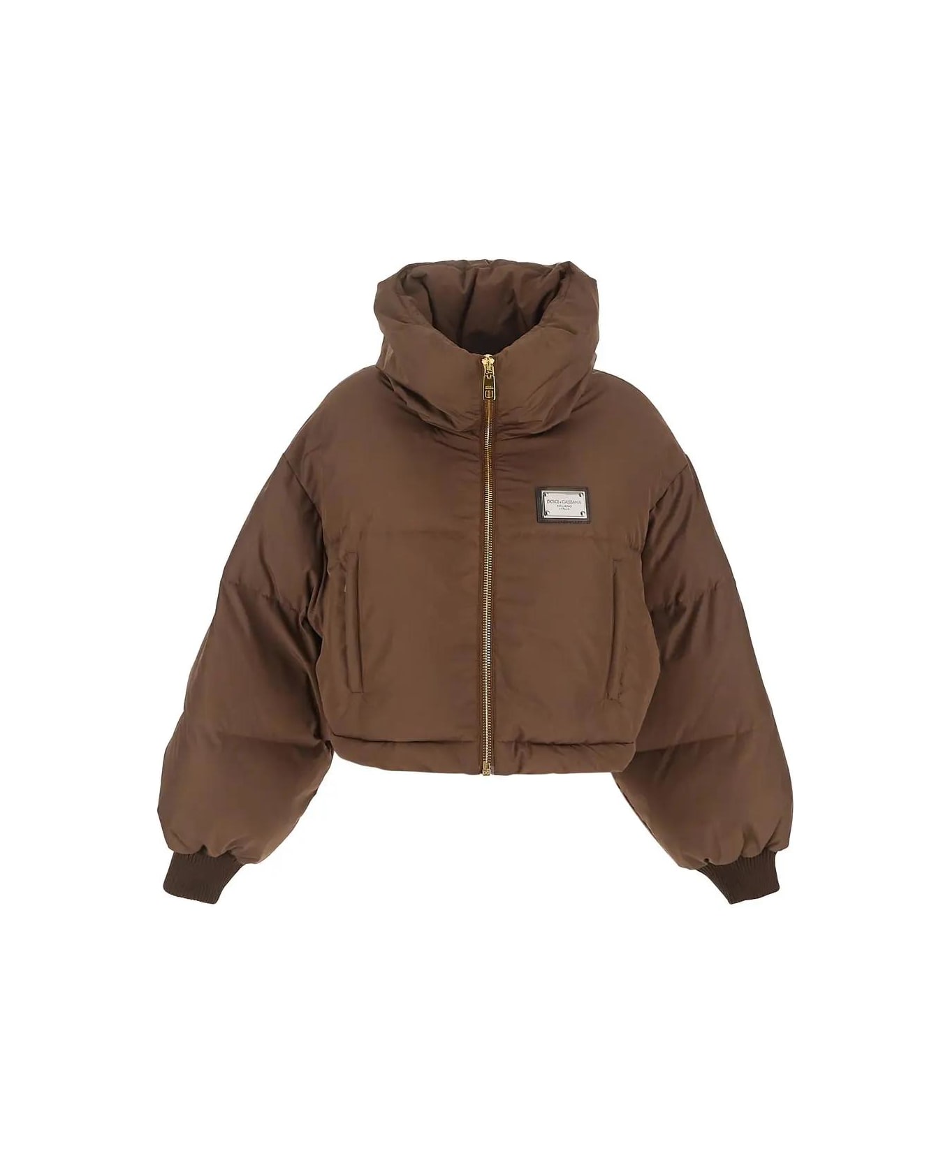 Dolce & Gabbana cropped down jacket in brown polyester with high neck, a branded metal plaque with leather detail patched on the chest, zip closure, two front zipped pockets, long sleeves, adjustable drawstring at the waist and elastic ribbed cuffs. Composition: 100% Polyester