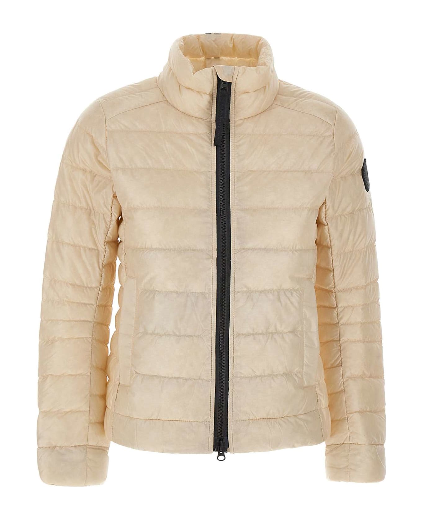 Canada Goose 'Cypress Jacket' women s down jacket, cream, skewered effect, in Ripstop nylon, windproof, water repellent, super light, padded collar with reflective details, front zip fastening with double-slider logo, two side pockets with hidden zip, foldable in inner pocket, removable elastic inner backpack straps to carry garment on shoulder, iconic logo patch on left sleeve, cuffs in Power Stretch for greater protection from cold, an internal pocket, regular fit with light sidecut on sides, ideal in high and low season. Every Canada Goose product purchased from an authorized retailer has a lifetime warranty against defects in material and workmanship for entire life of product.