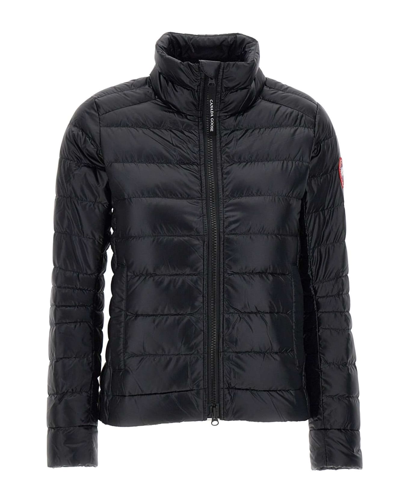 Canada Goose "Cypress Jacket" woman down jacket, black, metallic effect, in Ripstop nylon, windproof, water repellent, super light, padded collar with reflective details, front fastening with logoed double-slider zip, two side pockets with hidden zip, foldable into the pocket lining, removable internal elasticated backpack straps to carry garment on shoulder, iconic logo patch on left sleeve, Power Stretch® cuffs for greater protection from cold, one inside pocket, regular fit with slight waisting on the sides, ideal garment in high and low season. Every Canada Goose product purchased from an authorized reseller has a lifetime warranty against defects in materials and workmanship for life of product.