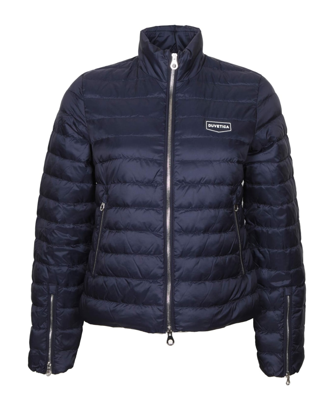 Short down jacket in shiny nylon blue color water repellent material horizontal quilted front logo shield double slider zip closure regular fit long sleeves thermal insulation: lightweight filling: 90% down / 10% feathers external composition: 100% polyamide internal composition: 100% polyamide made in indonesia