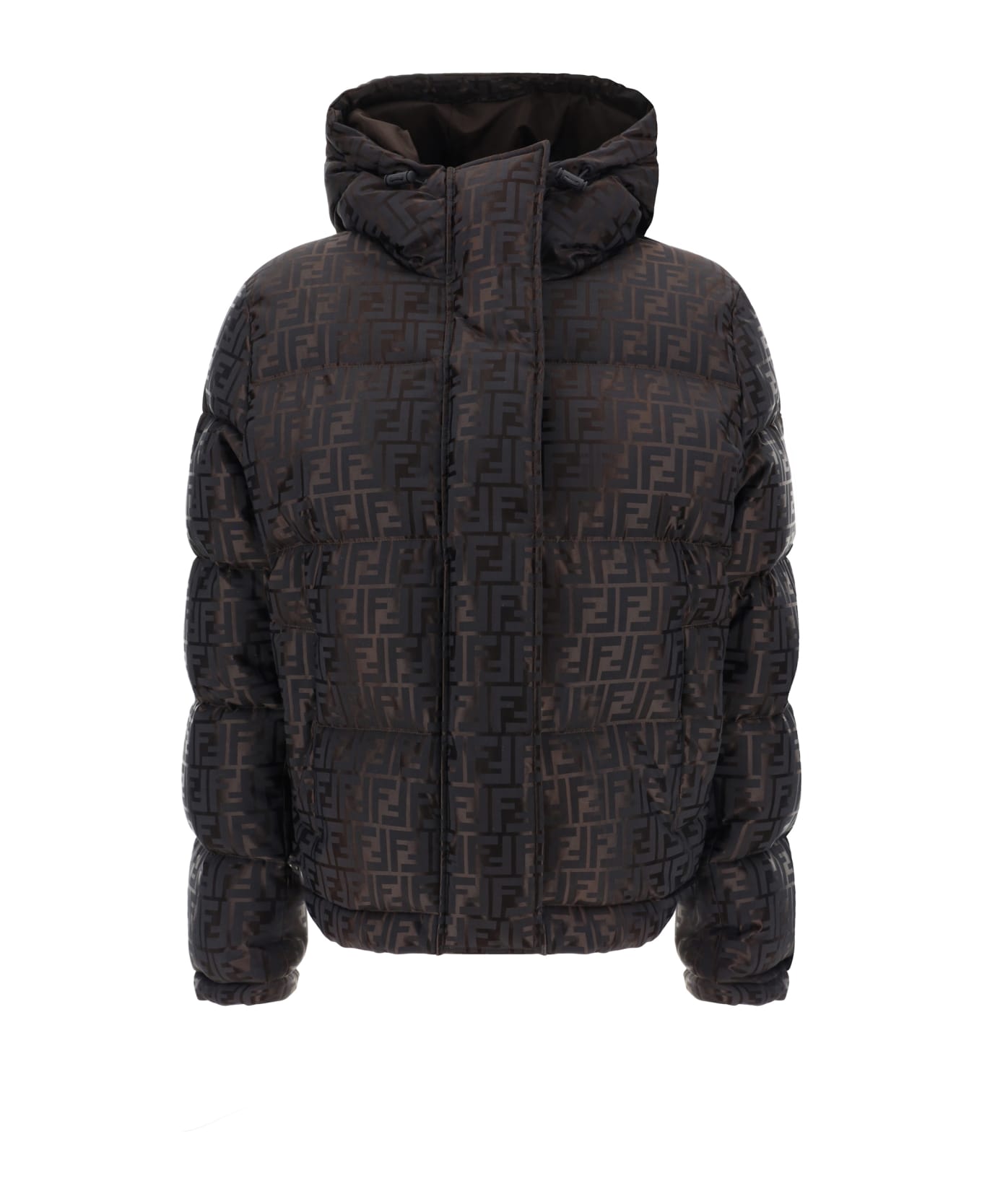 Cotton down jacket by fendi, high-neck design with drawstring-adjustable hood, front button and concealed zipper closure, two slit pockets appliqué on front, drawstring-adjustable hem, padded and quilted design, all-over pattern with iconic ff brand logo repeated, regular fit.