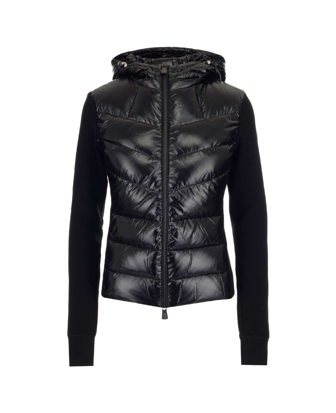 Fitted outdoor jacket from Moncler Grenoble in techno jersey and down padded glossy black nylon, with fixed hood and front zip closure