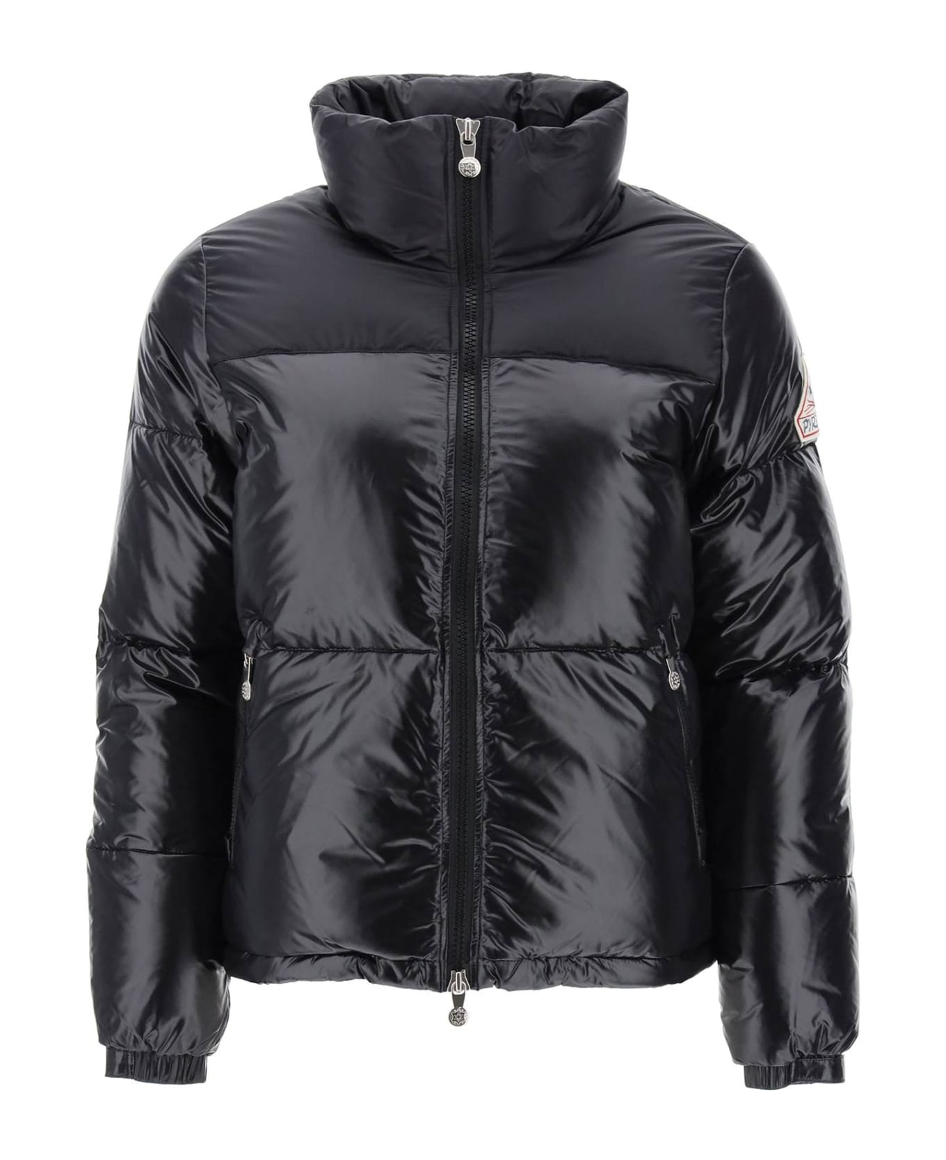 Pyrenex short down jacket in shiny nylon with matte nylon yoke and collar, horizontal quilting and 90/10 duck down padding. Two-way zip closure, zip pockets, adjustable cuffs, drawstring hem, one internal pocket. Logo patch on the sleeve. The model is 177 cm tall and wears a size FR 36.