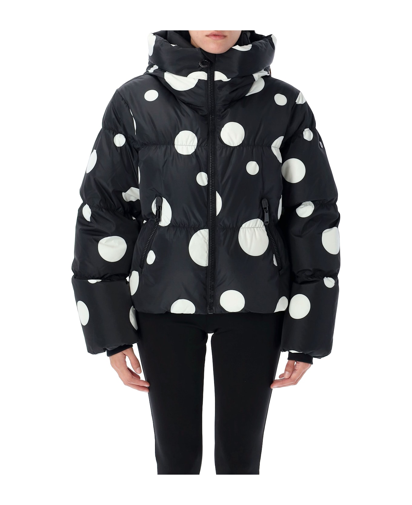 Grand Ski Down Jacket By Goldbergh. Featuring: Partly Recycled Outer Shell Fabric Partly Recycled Lining With Anti-odor Finish Rds Certified Down Allover Dot Print Adjustable Hood Front Zip Closure 2 Pockets, 2 Inner Pockets And A Sleeve Pocket For A Ski Pass Fixed Hood Detachable Snowcatcher Inside Carry Strap Knitted Cuffs At Inside Sleeves Note: Print Is Random, Every Garment Is Different. Model Is 1,70 M And Wears Size 36