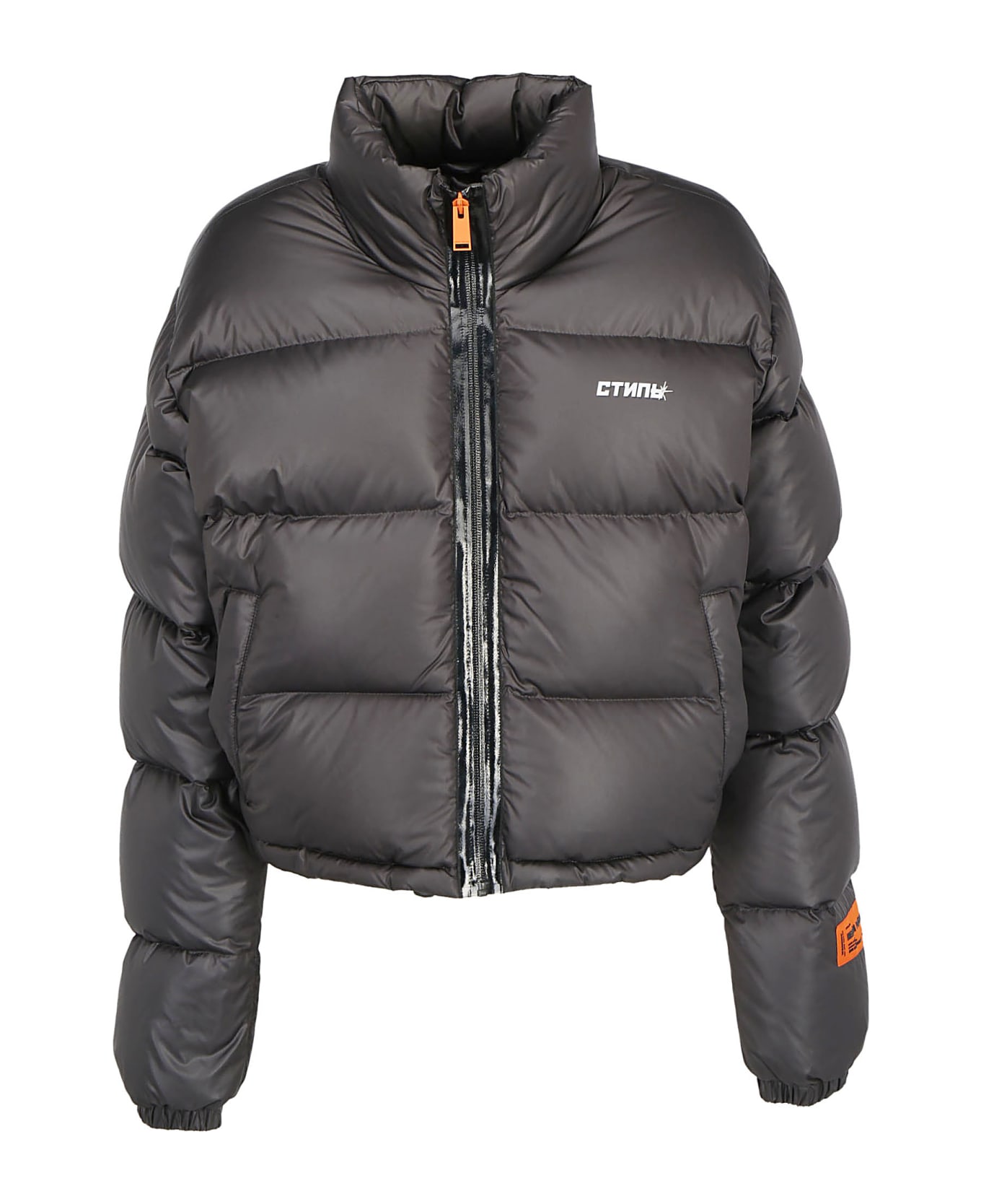 Grey Down Jacket by Heron Preston, crop fit, quilted design, zip closure on front, two slit pockets with zip closure, logo on back orange label, hem with adjustable drawstring. Composition: 100% Polyester