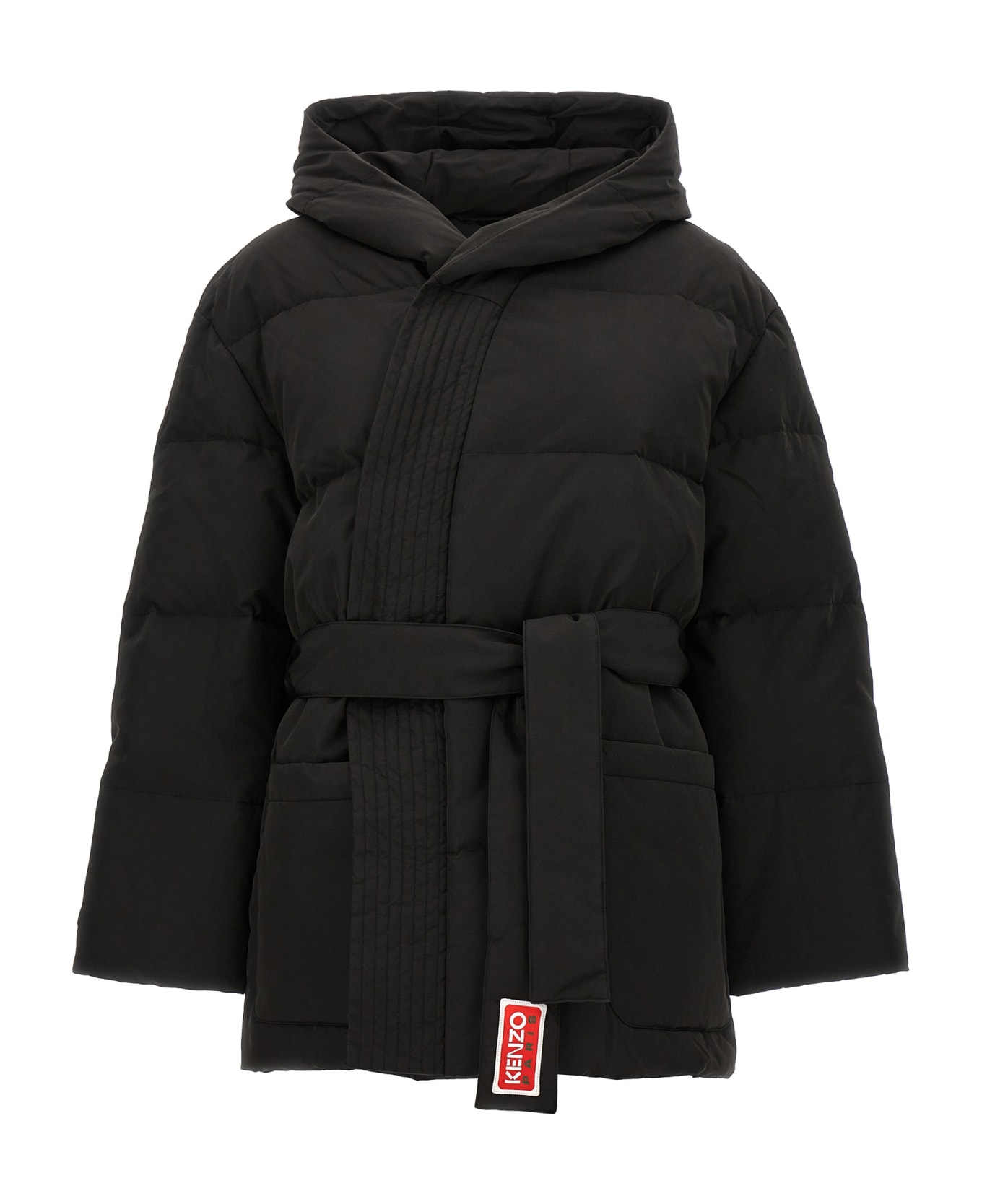 'Kimono' down jacket with covered snap button closure, hood and removable belt.