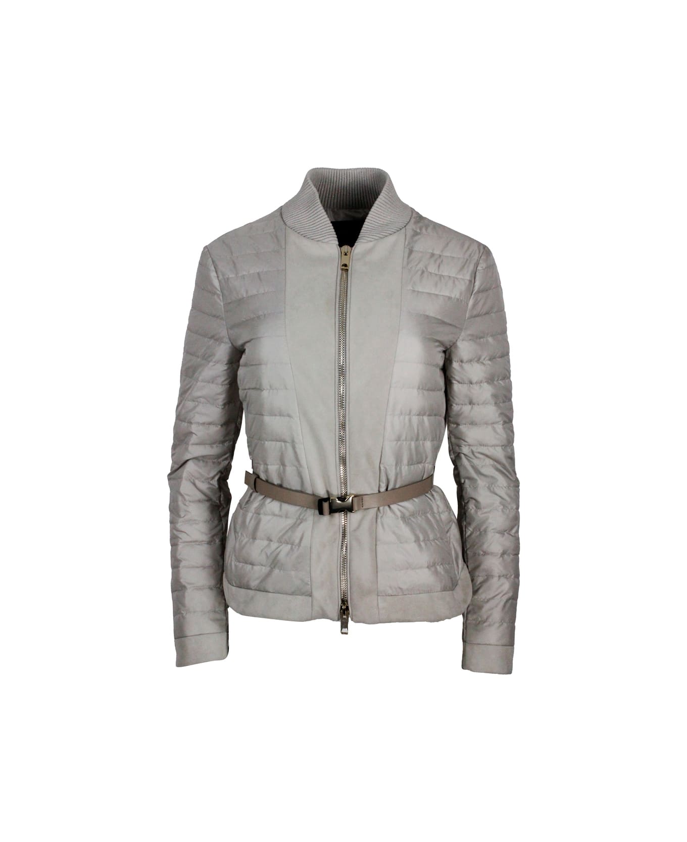 light padded jacket, 100 gram down jacket with suede inserts and knit collar with lurex. leather belt Composition: 92% Polyester, 2% Cotton, 1% Viscose, 5% Leather