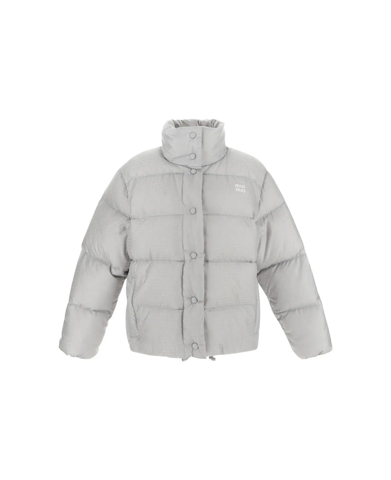 Miu Miu down jacket in cloud grey recycled polyamide with pulled neck, logo jacquard, long sleeves, elasticated cuffs, drawstring waistband, horizontal padding, covered snap buttons, concealed zio closure, side welt pockets and white embossed logo print on the chest.