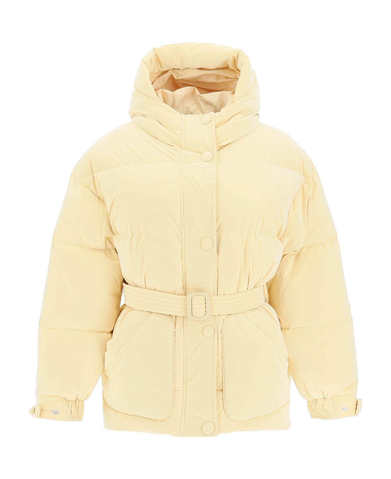 Oversized jacket by Ienki Ienki made of quilted lightweight nylon with down padding, cinched at the waist by a matching belt. It features a fixed hood, a concealed zip and snap fastening, adjustable cuffs, external patch pockets and an internal pocket. Cotton lining. The model is 177 cm tall and wears a size XS.
