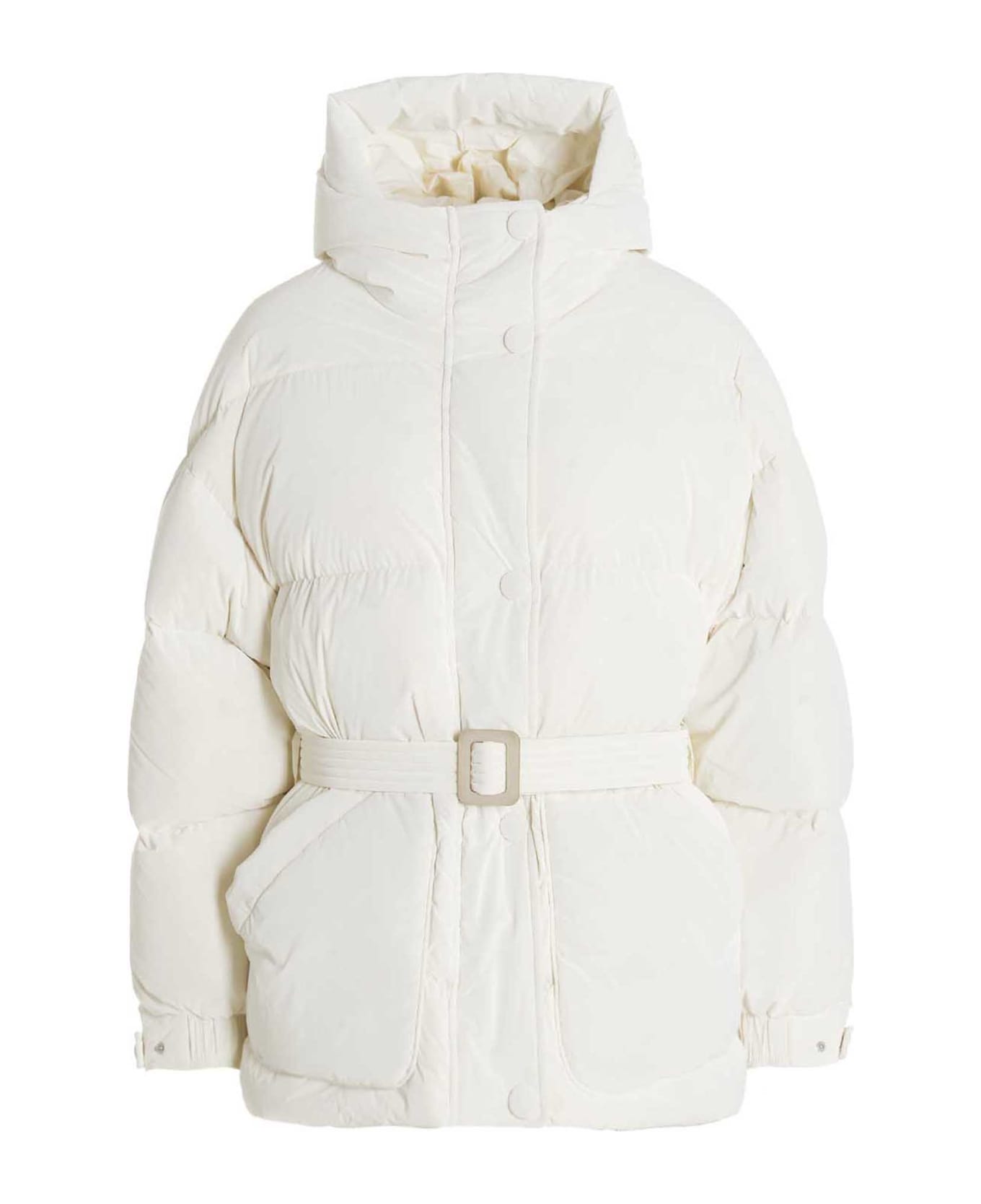 Powder nylon 'Michlin' down jacket with down filling, a hood, a double snap button, a zipper closure, and a waist belt.