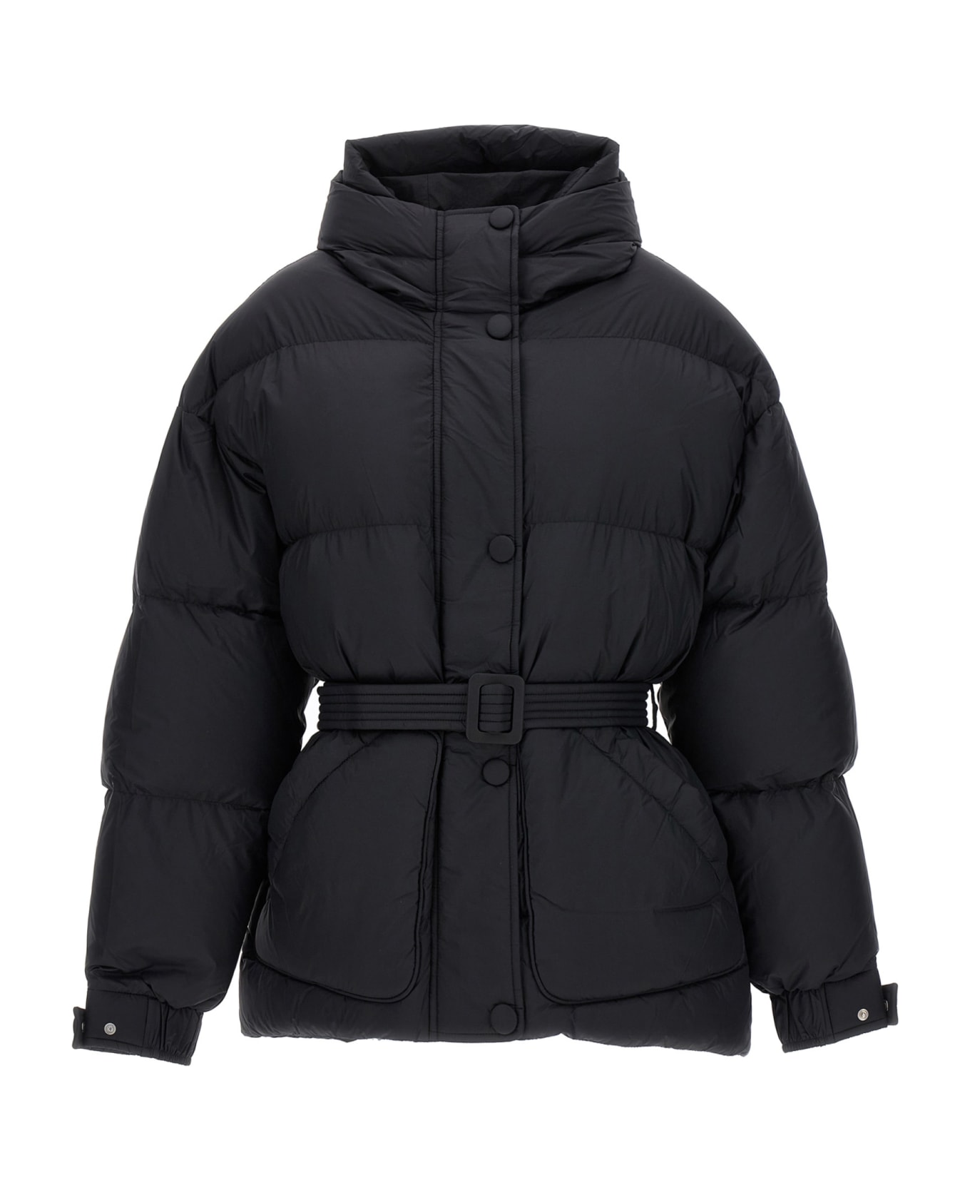 Michlin' nylon down jacket with goose down padding, hood, double snap button and zip closure, belt at the waist, pockets, long sleeves with elastic and adjustable cuffs.