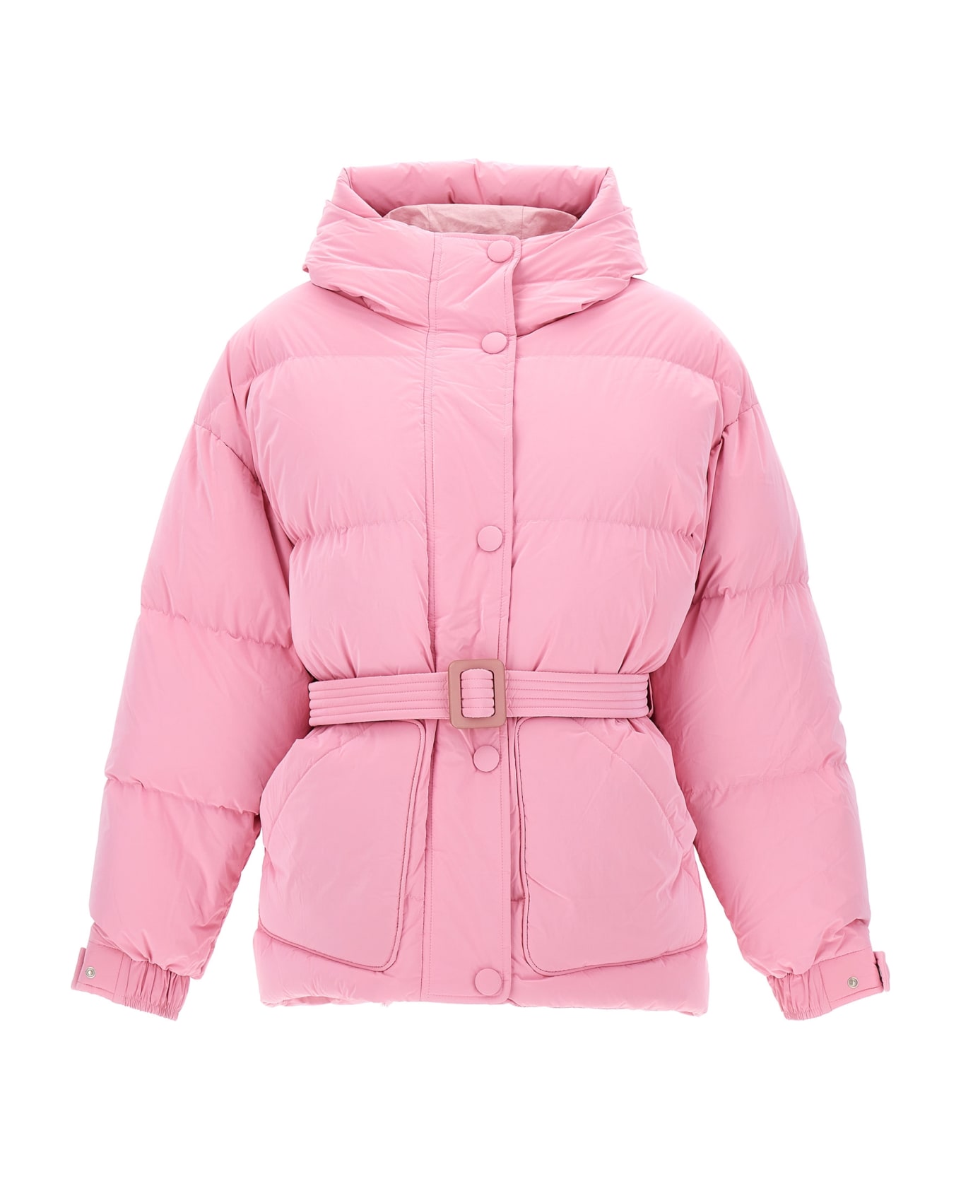 Michlin' nylon powder down jacket with goose down padding, hood, double snap button and zip closure, belt at the waist, pockets, and long sleeves with elastic and adjustable cuffs.