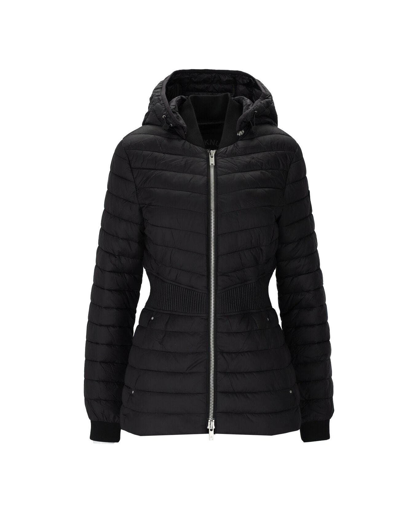 Moose Knuckles Vanilla Sky jacket made of black nylon, featuring an elastic insert to highlight the waist. Welt pockets with zip on the front, detachable and adjustable hood with drawstring, rubberized logo on the sleeve. Collar and cuffs in ribbed stretch fabric. Double slider zip closure. Outer and lining composition: 100% recycled nylon. Filling: 100% polyester.