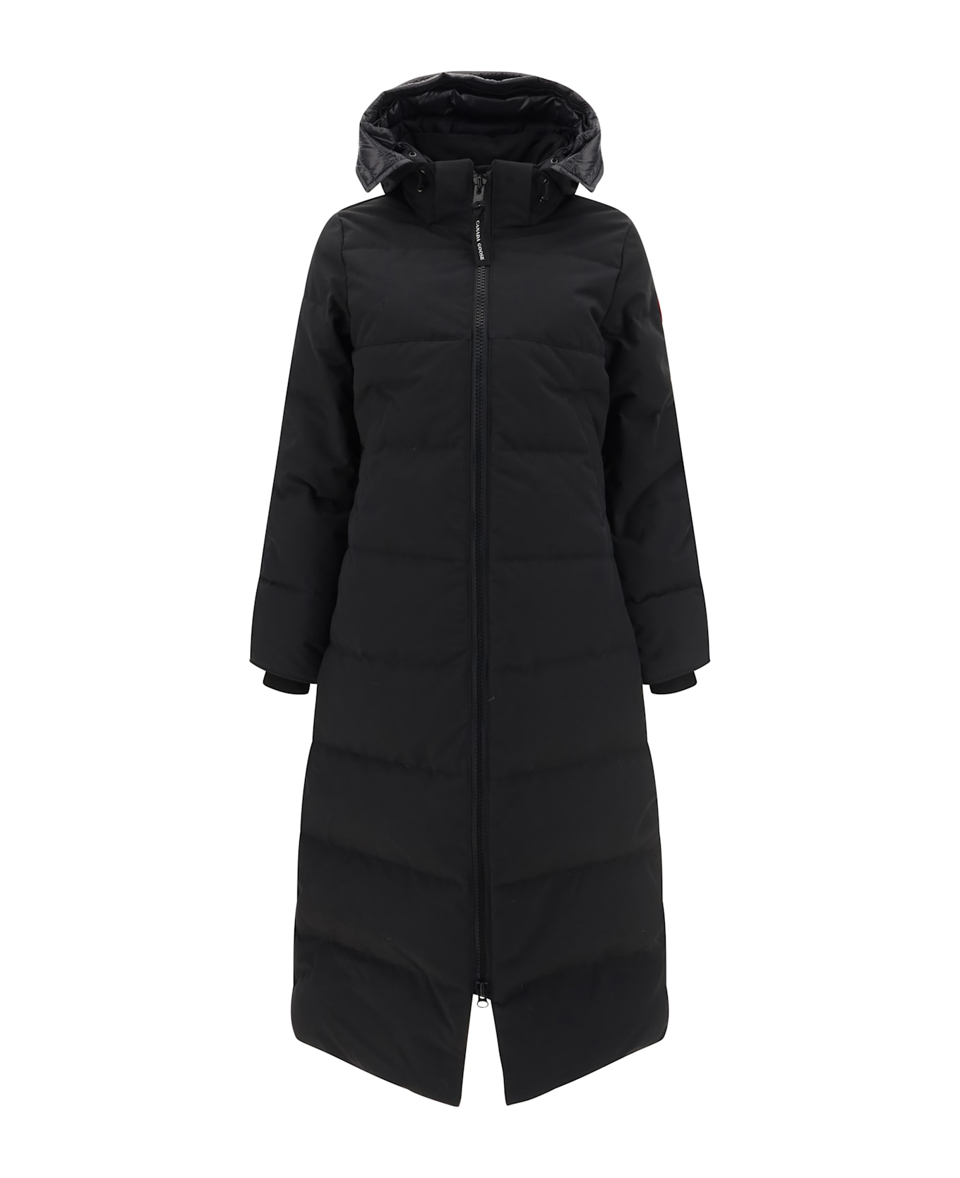 Mystique down jacket by canda goose, long hooded model, front zipper closure, elastic ribbed cuffs, quilted and padded design, two side welt pockets, contrasting applied iconic brand logo patch on left shoulder, waterproof material to stay dry and resistant to cold weather, artic tech material.