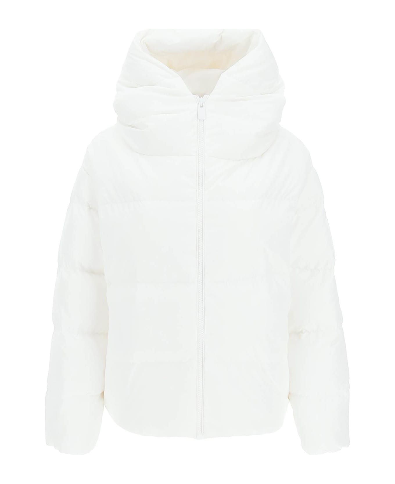 Short oversized puffer jacket by Bacon made of boudin-quilted techno taffeta, padded in duck down and feather. Provided with hood, zip fastening, side zippered welt pockets and inner elastic drawstring at the hem. Enriched by a silicone logo patch on the sleeve and lined, with one inner pocket. The model is 177 cm tall and wears a size XS.
