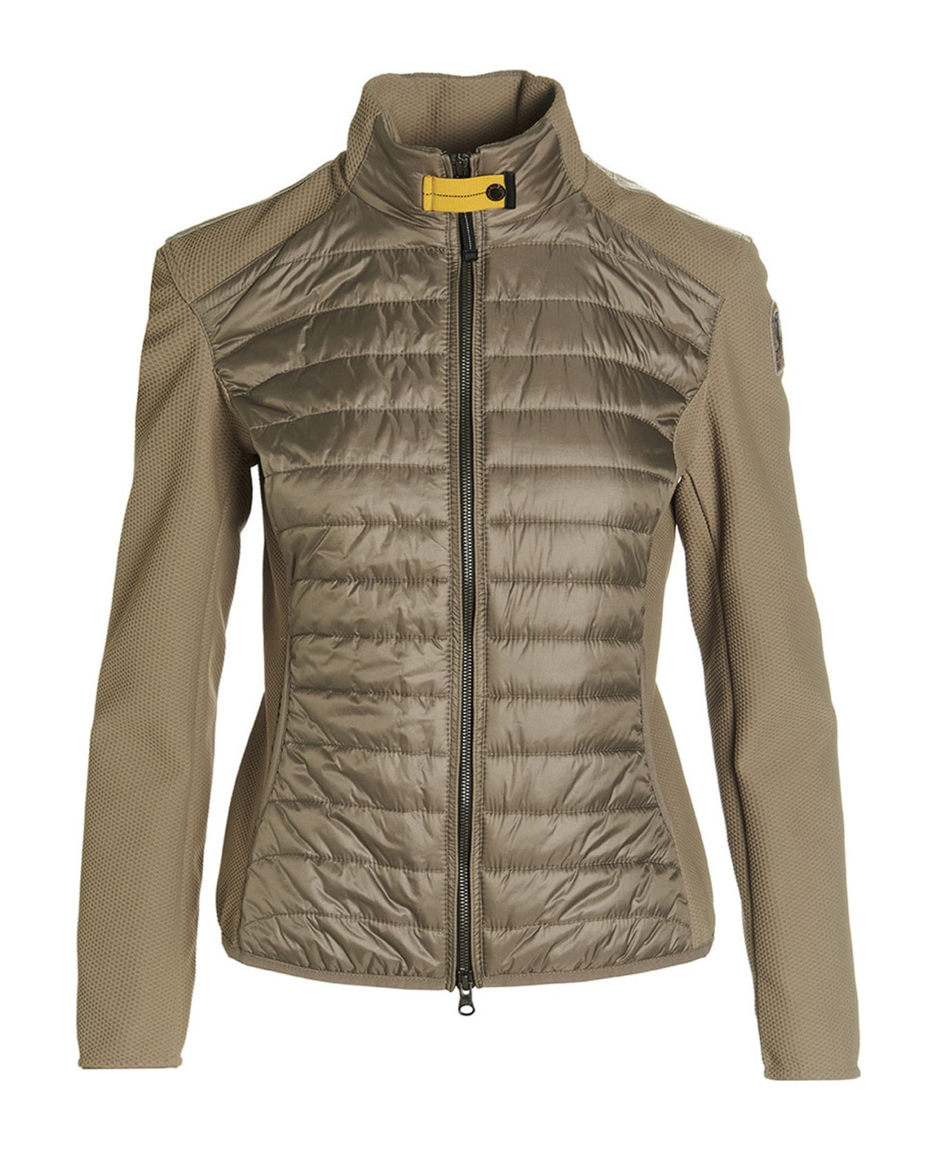 Olivia' water-repellent nylon jacket with high density 20 3d down padding, texture knitted inserts of polyester bee with soft fleece, a double-slider zip closure, pockets, and a logo patch on the sleeve.
