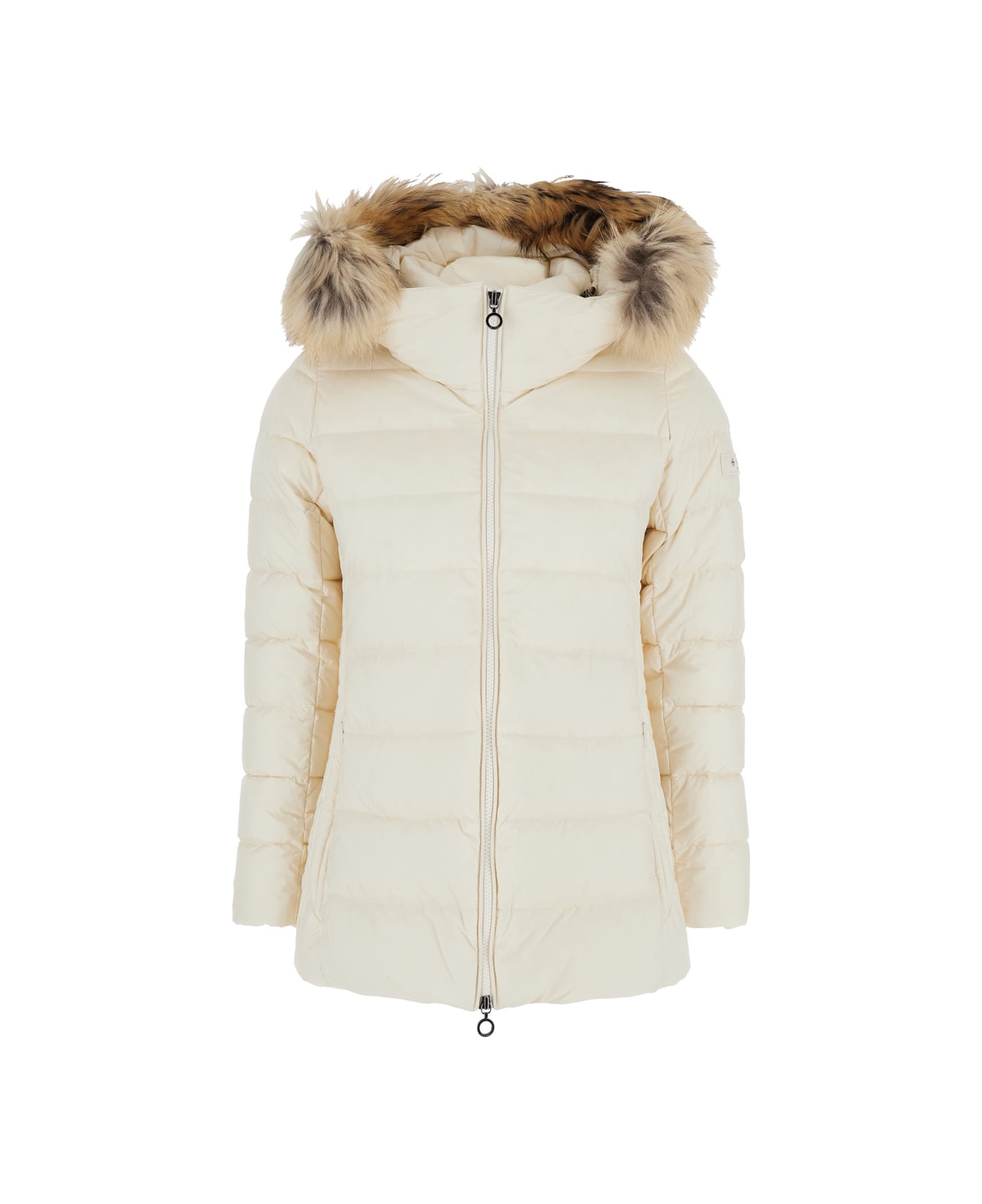 Down jacket White Fixed hood with fur trim Long sleeves Front closure with two way zip Two front zipped pockets Down filled and quilted Logo detail Nylon Regular fit