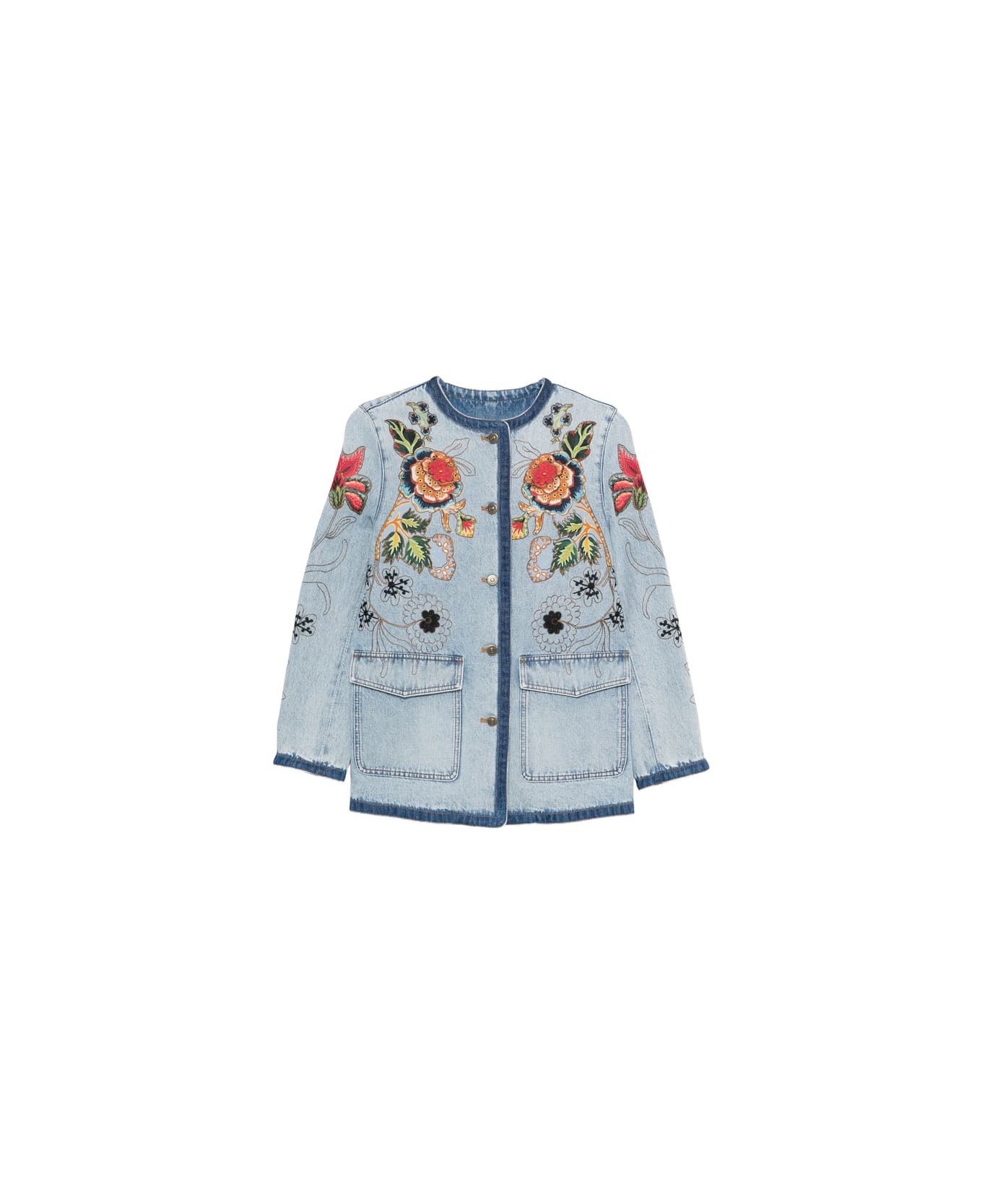 light blue floral embroidery front flap pockets button fastening round neck trim detail