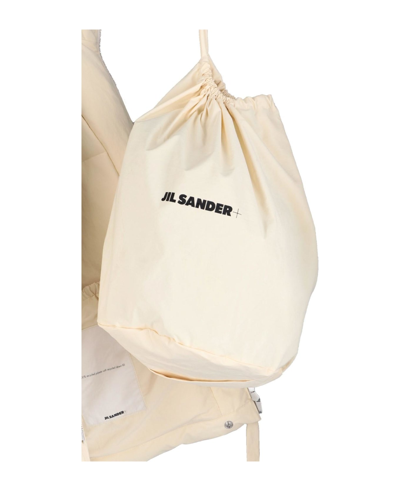 Jil Sander Padded Down Jacket, nylon, cream color, high collar, hood, zipper front closure, straight hem, dust bag included.