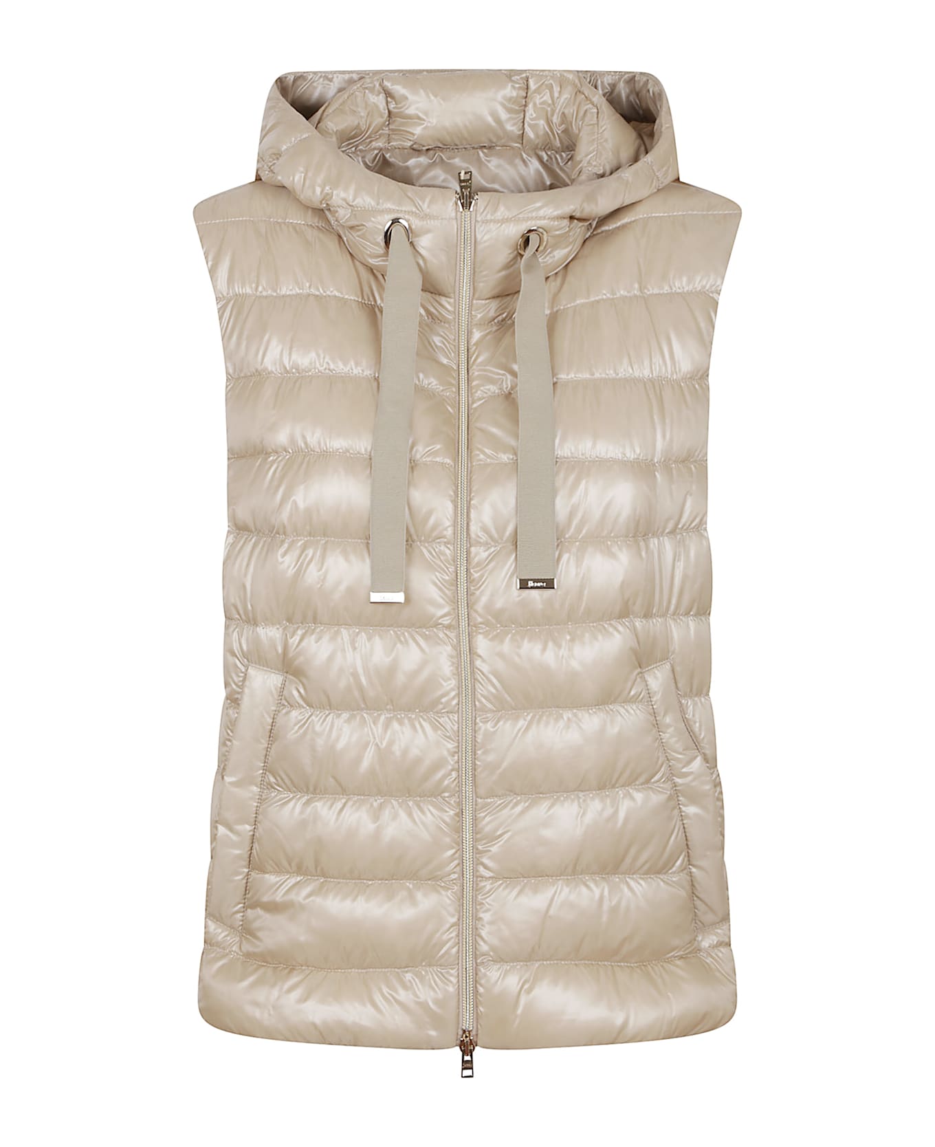 Vest made from HERNO`s iconic Ultralight Nylon. Down padding with striped quilting; double slider zip fastening; hood with grosgrain drawstring; side pockets. Design featuring a choice of 20 denier Japanese Nylon and a high-quality 90/10 down injected to provide an even lighter feel. The result is good water resistance with a particularly luxurious tactile effect similar to silk. Featured with side slits finished in monogram: using a fine jacquard technique, this cotton and nylon fabric is embellished with the Herno logo and finished with a water-repellent coating and metal Herno logo on the back.