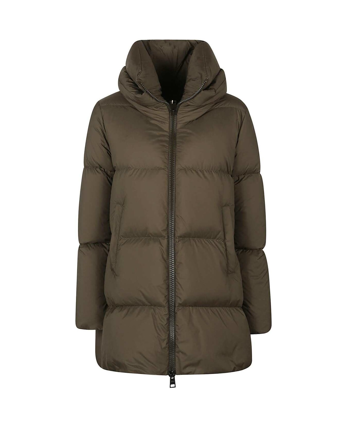 Military green A-shape in recycled nylon microfiber from Herno, high collar, double-slider zip fastening, side zips, zip pockets, metal logo on the back, goose down padding. Relaxed fit
