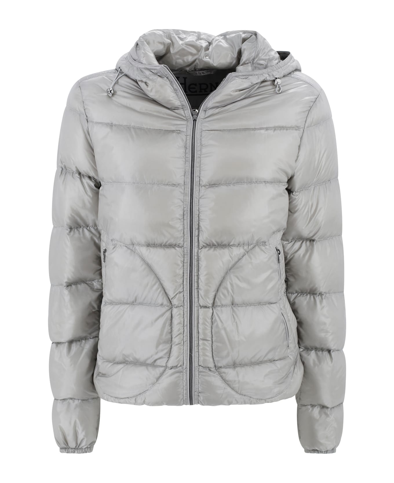 Lightweight puffer jacket with hood, a versatile garment made from water-repellent technical fabric with a matte finish, padded with goose down to provide excellent thermal insulation. The design features horizontal quilting, an adjustable hood with drawstring, front zip closure, and side zip pockets.